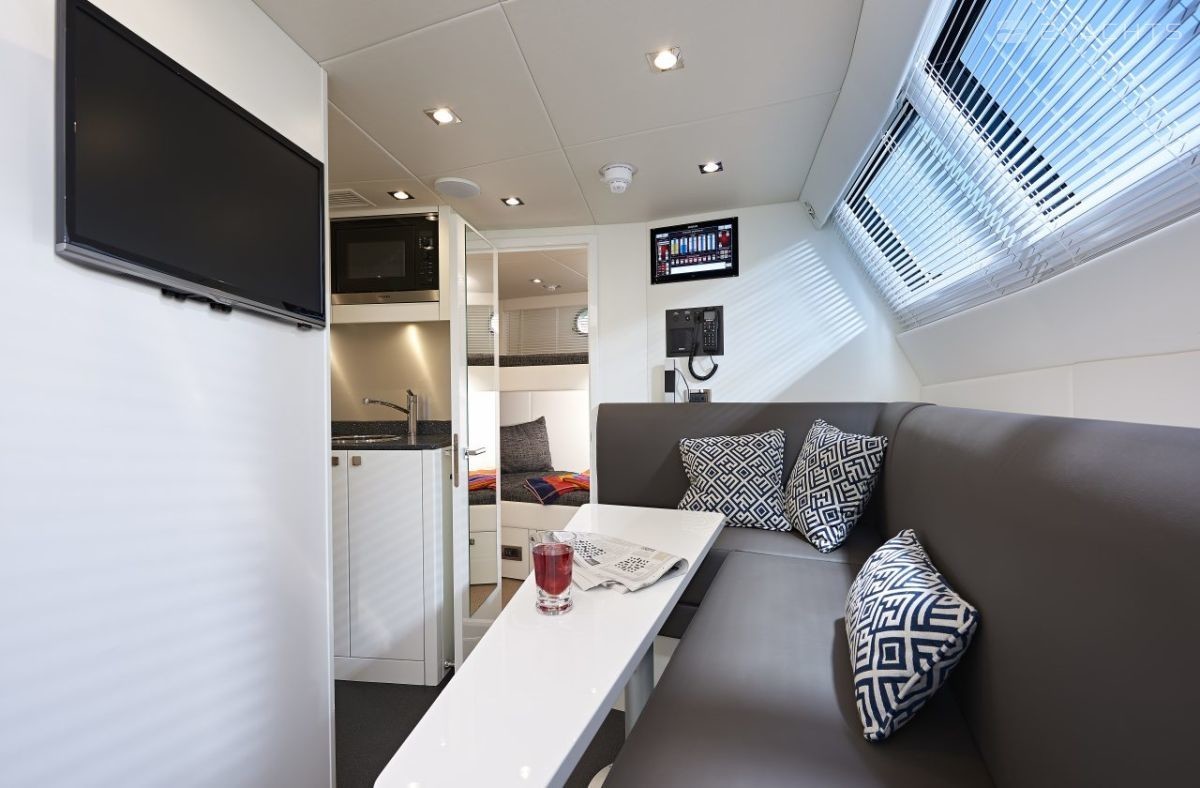 Pour agrandir l'espace libre, le poste de contrôle central a été déplacé à flybridge, ainsi qu'une vaste zone de loisirs, un bar et un bain à remous.