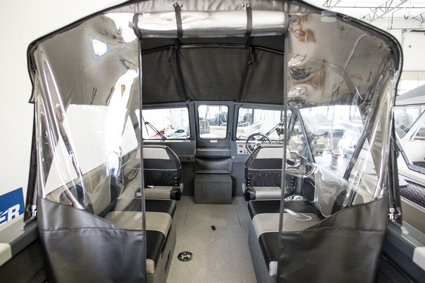 Boat with hardtop and semi-enclosed cabin