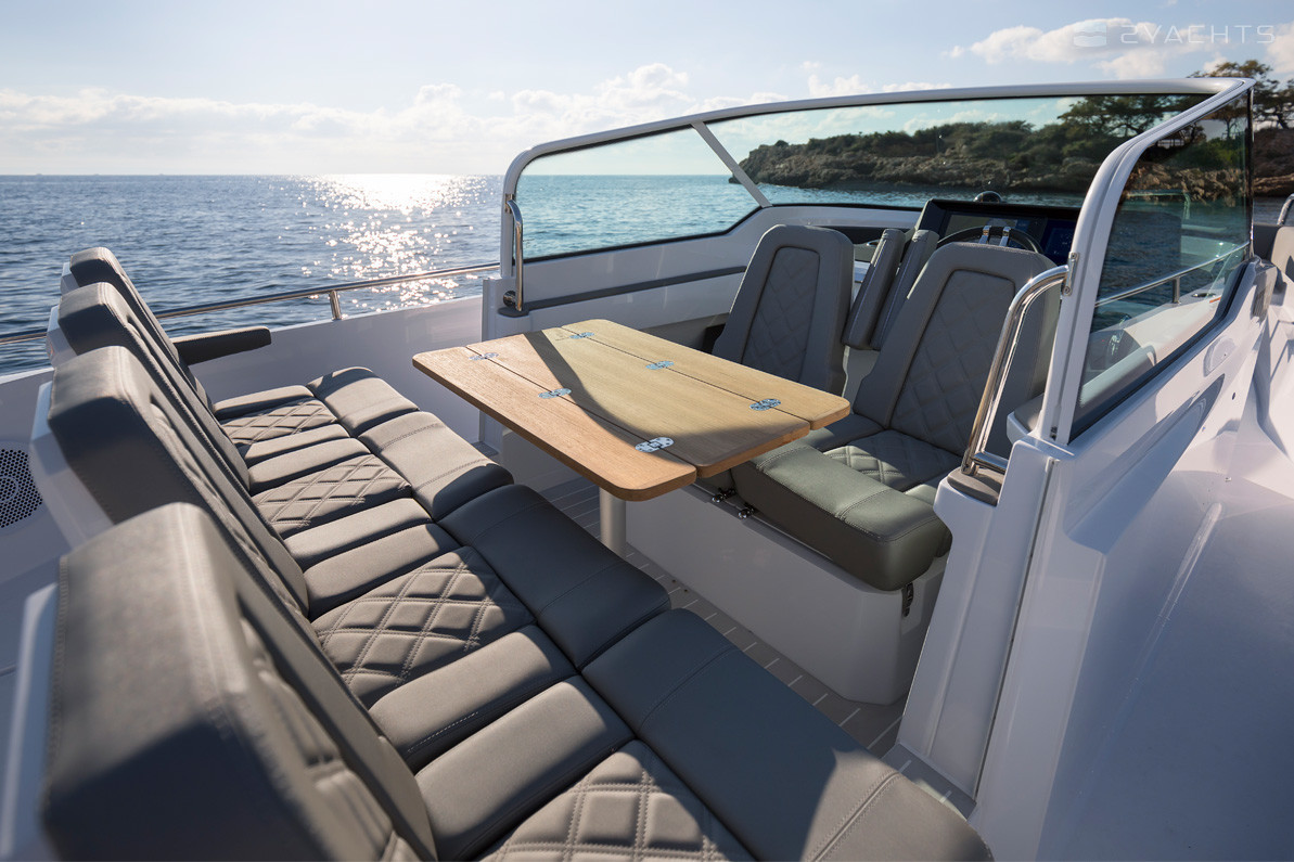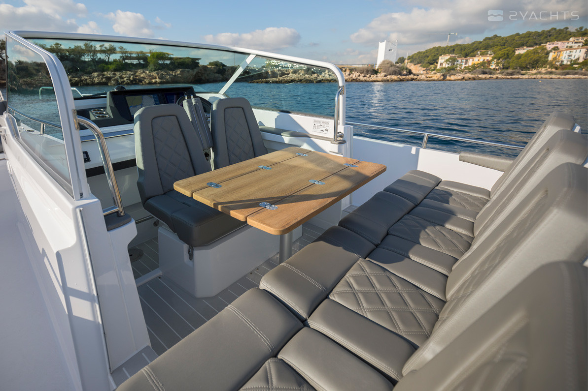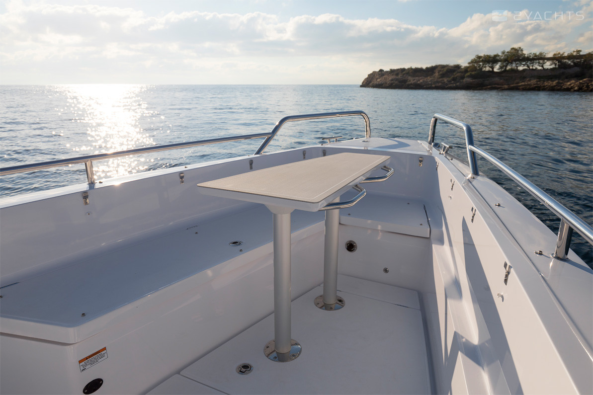 Ai lati, ci sono passaggi che conducono ad una piattaforma a prua aperta dotata di un divano ad angolo morbido con armadietti incorporati, accanto al quale è installato un tavolo estraibile compatto, incluso nella configurazione di base del modello. La poppa della nave è dotata di due aeratori, piattaforme con una scala pieghevole per l'accesso all'acqua, corrimano in metallo e un gancio di traino.
