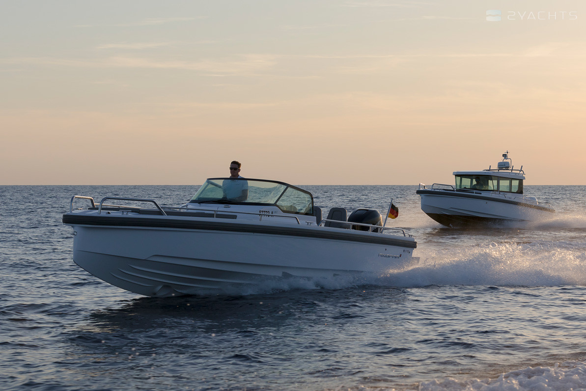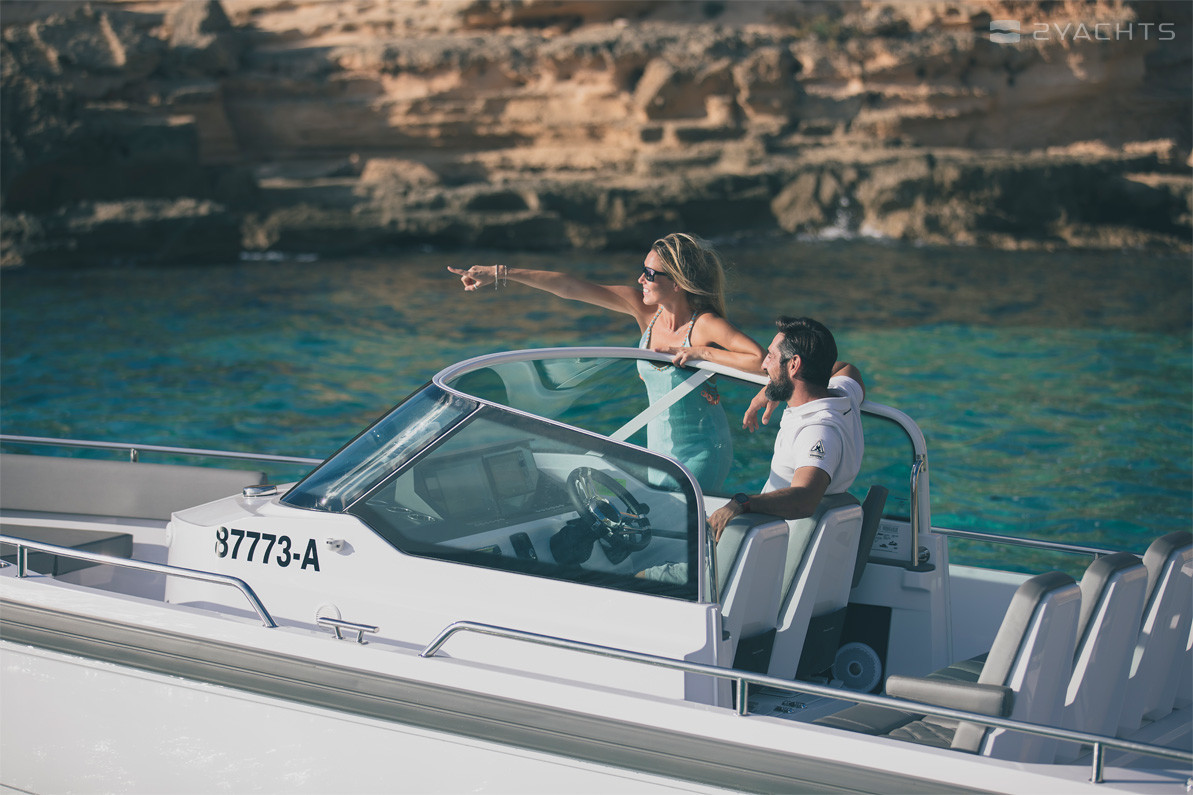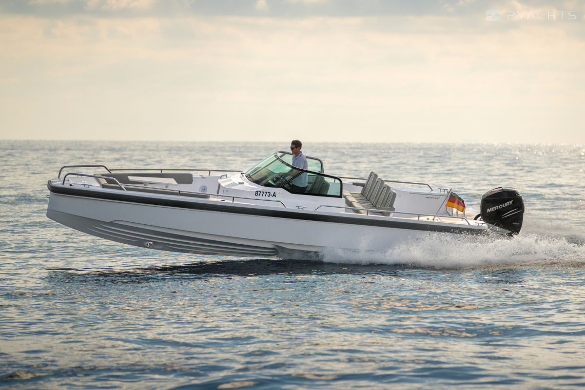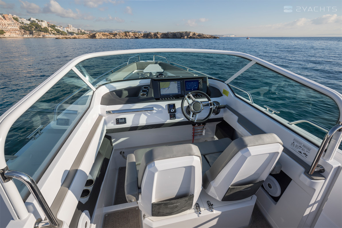 Ai lati, ci sono passaggi che conducono ad una piattaforma a prua aperta dotata di un divano ad angolo morbido con armadietti incorporati, accanto al quale è installato un tavolo estraibile compatto, incluso nella configurazione di base del modello. La poppa della nave è dotata di due aeratori, piattaforme con una scala pieghevole per l'accesso all'acqua, corrimano in metallo e un gancio di traino.