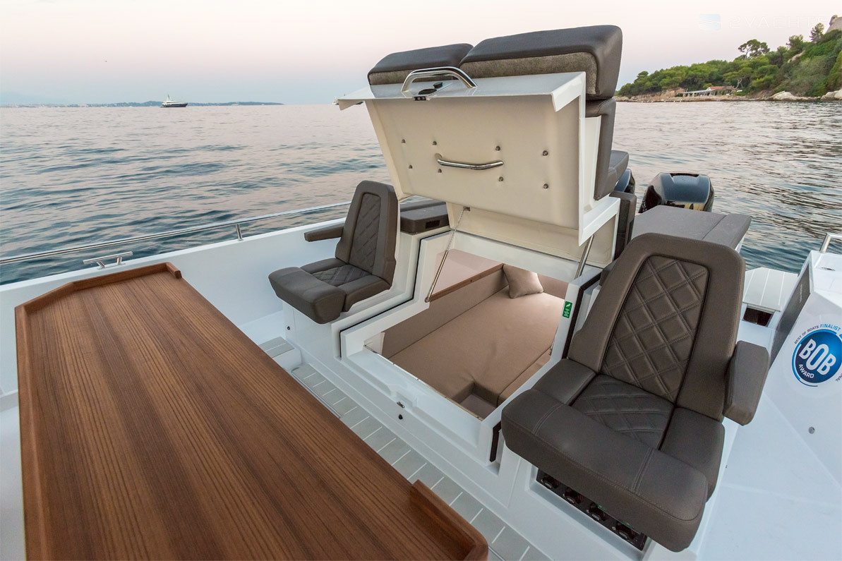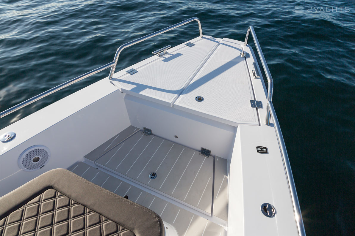 Attraverso i passaggi posti ai lati e recintati con ringhiere metalliche, è possibile accedere alla piattaforma di prua aperta, dotata di un ampio lettino per due persone e una poltrona compatta con un armadio incorporato. A poppa, c'è un altro doppio lettino e due piattaforme con una scala per accedere all'acqua, un aeratore, corrimano in metallo e un gancio di traino.