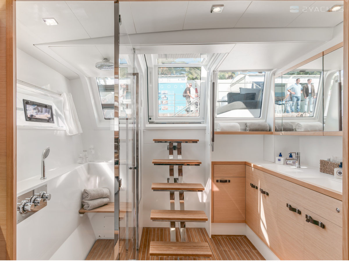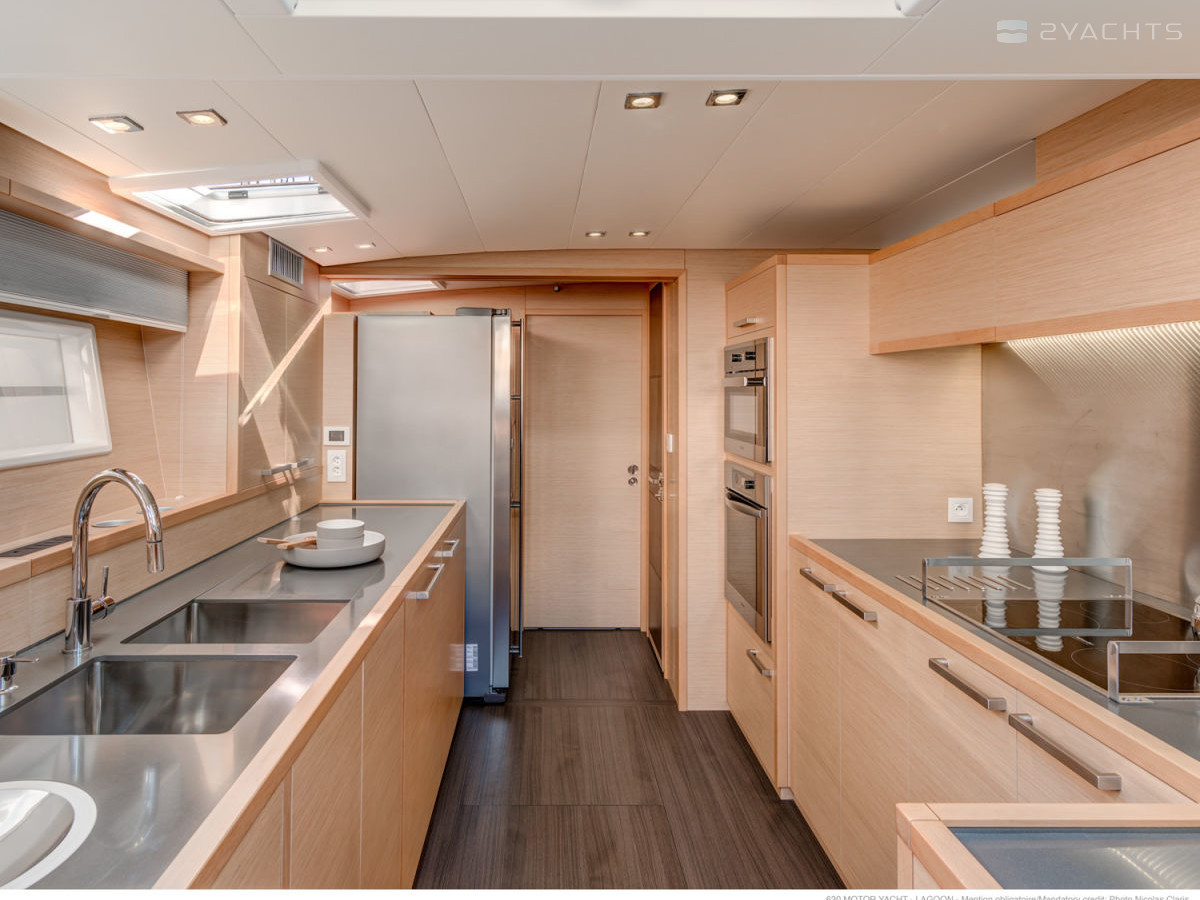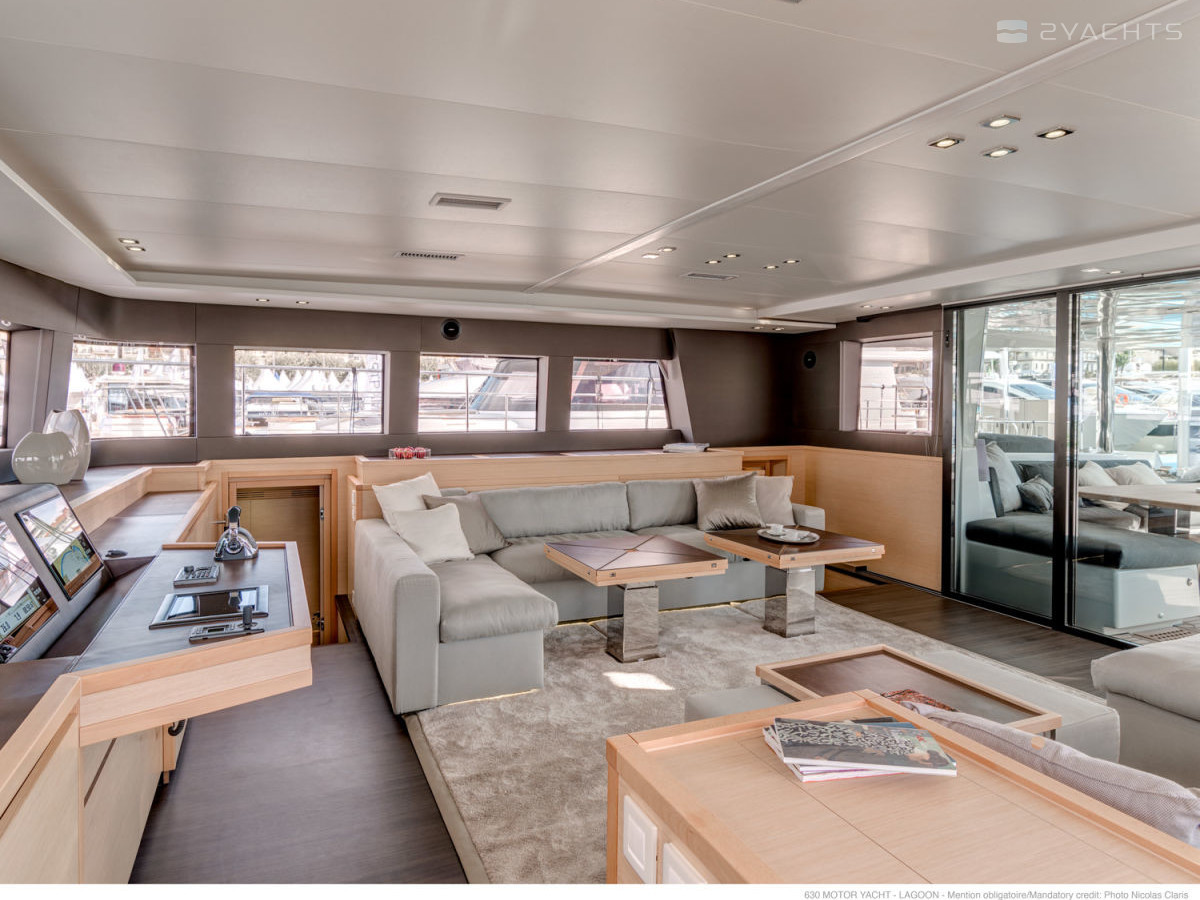 La poppa Lagoon 630 MY è dotata di due piattaforme con scale rimovibili per l'accesso all'acqua e un gancio di traino. All'interno dell'abitacolo, ci sono due morbidi divani angolari con tavoli compatti e diverse poltrone, un pannello di controllo elettronico con una scrivania e ai lati ci sono porte che conducono alle cabine della nave.