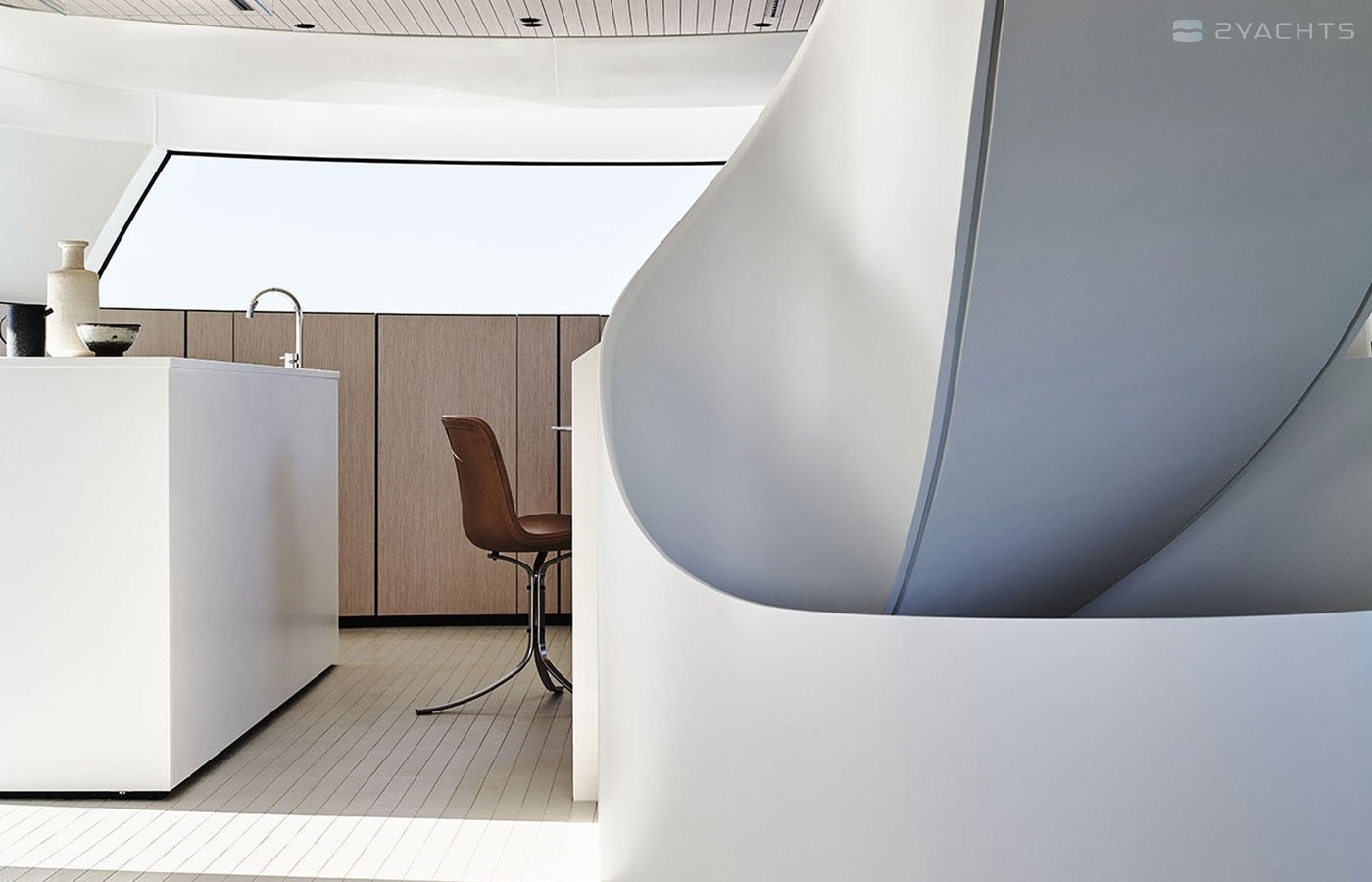 Cercando di dare comfort alla nave a casa, i progettisti hanno usato una disposizione libera dei mobili che non è tipica per uno yacht in cabina, che offre una buona vista dalle finestre. Accanto alla cabina si trova la cucina, rialzata sul podio, grazie alla quale si adatta con successo al design generale della nave. Quattro cabine e una cabina armatoriale situate al piano terra possono ospitare fino a 9 persone. Una piattaforma di nuoto a poppa può affondare nell'acqua e "lavorare" come un beach club o facilitare l'atterraggio su un tender.