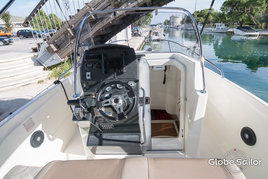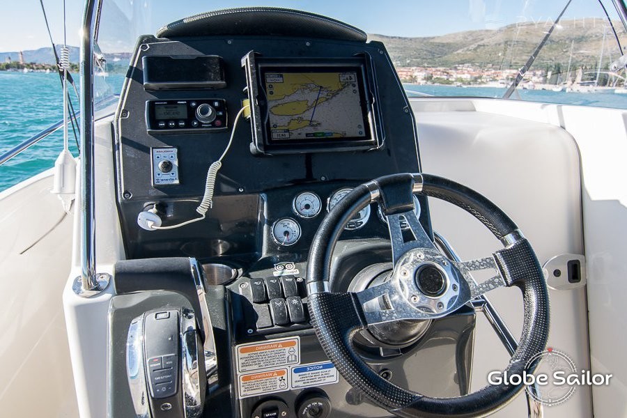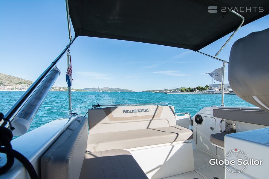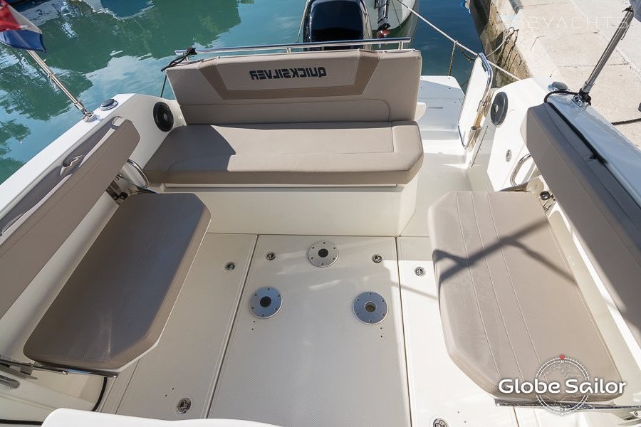 Outboard motors Mercury V6, V8 or Mercury 400R are installed on the Quicksilver Activ 805 Open boat, with power from 175 to 400 hp. The capacity of the fuel tank is 280 liters, and the capacity for storing water is designed for 80 liters. The vessel received CE (C) certification, which allows it to go to sea no further than 200 miles from the coast.