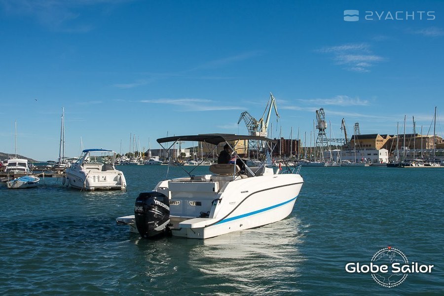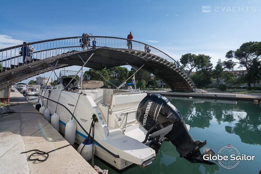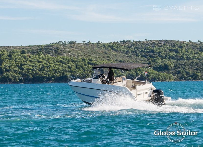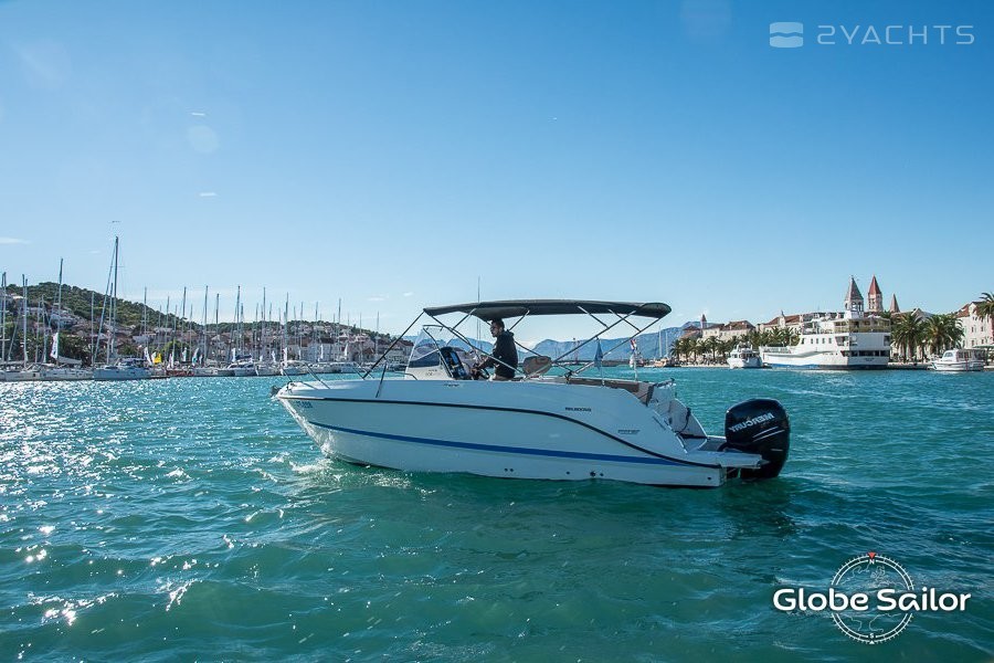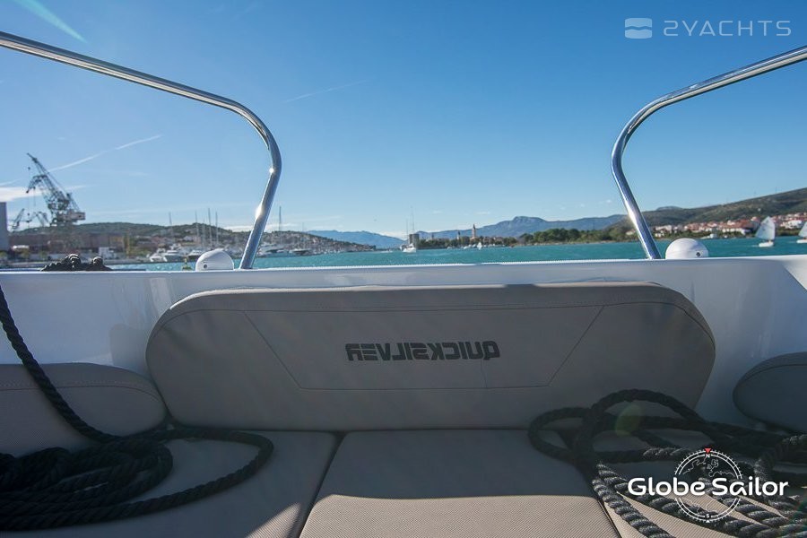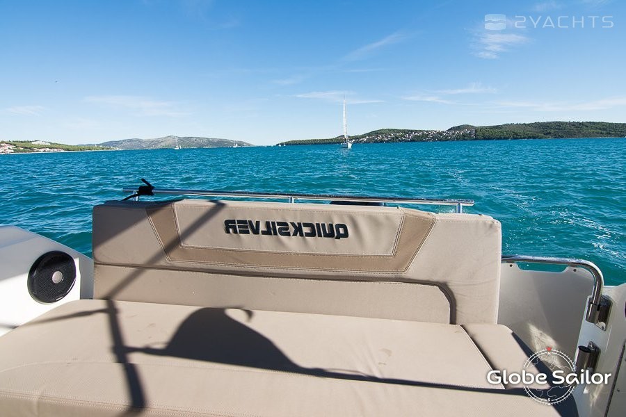 The Quicksilver Activ 805 Open is equipped with a self-draining cockpit, stainless steel bow anchor roll, hinged ladder and fishing rod holder. The model is made using fiberglass and manufactured by Quicksilver since 2014.