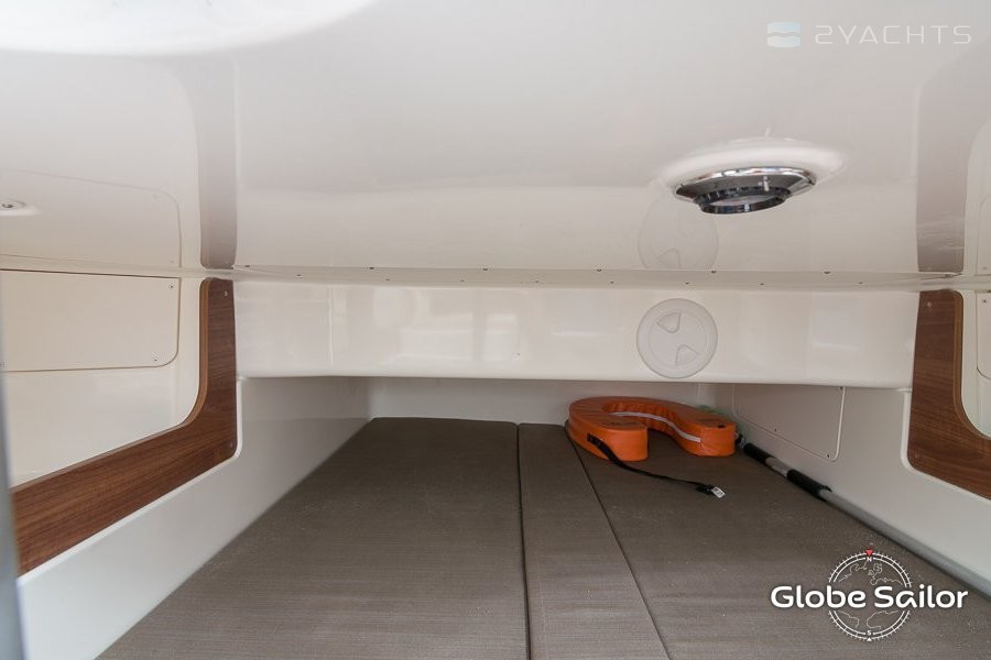 The control station is equipped with hydraulic steering, a 12 V electrical outlet, a gas and reverse gear mechanism, and a comfortable captain's chair. At the bottom of the deck are cabins for four people with double beds, shelves, cabinets and large portholes. An automatic pump is provided for pumping bilge water.