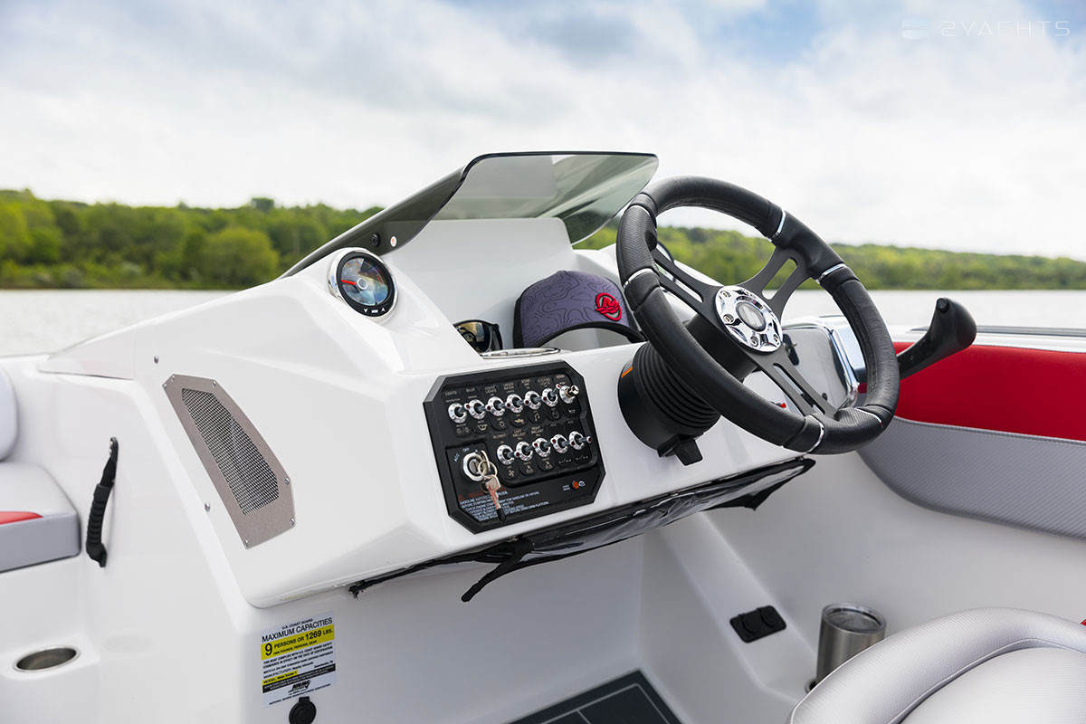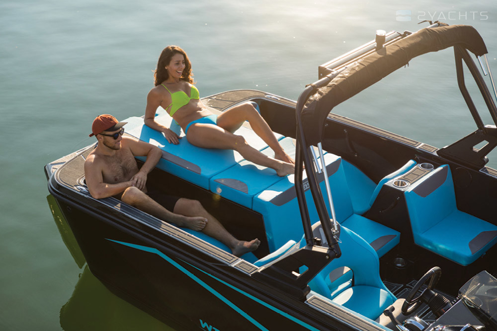 The cockpit and the bow of the vessel are not separated by a partition - this structural solution allowed us to increase usable space. The boat is equipped with a corner sofa with a built-in locker, a seat for two people and two seats (for the captain and passenger). There is a lockable drawer in the bow and a compartment for water skiing and wakeboard is built into the floor. Adjustment of the steering wheel and the adjacent seat is provided.