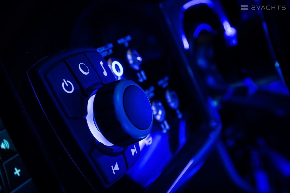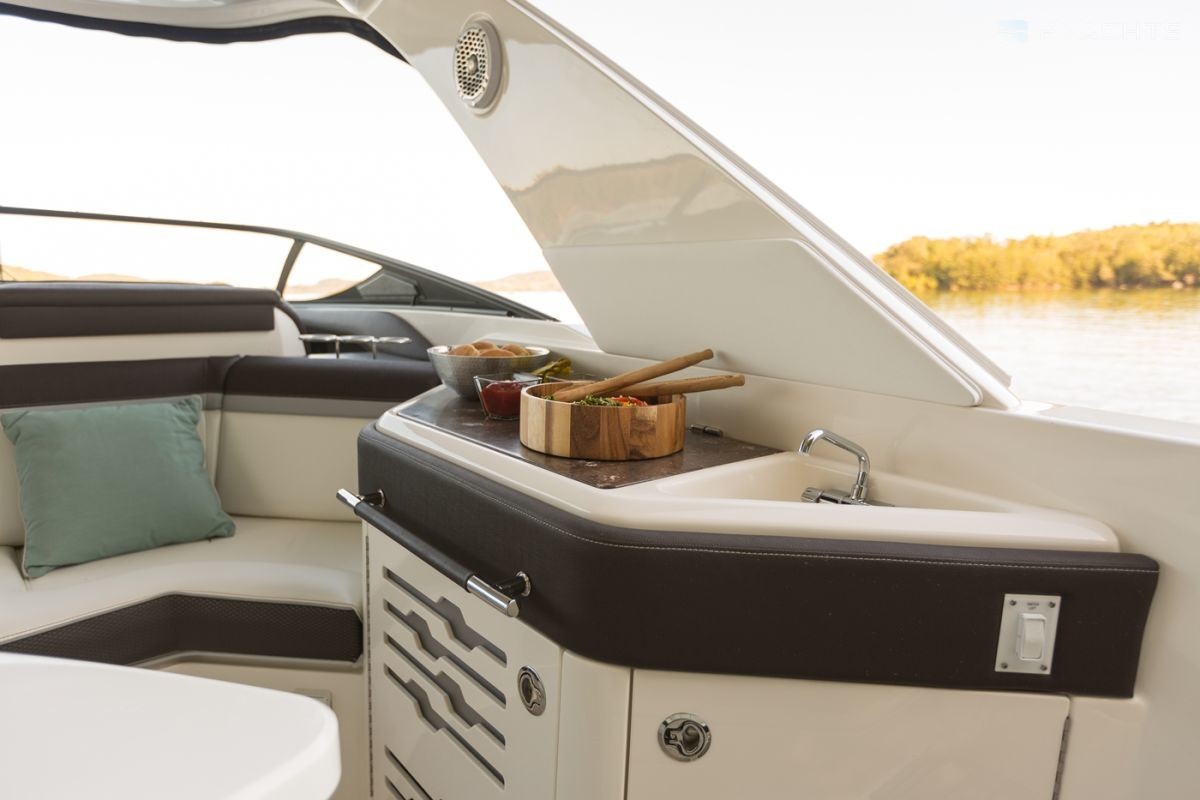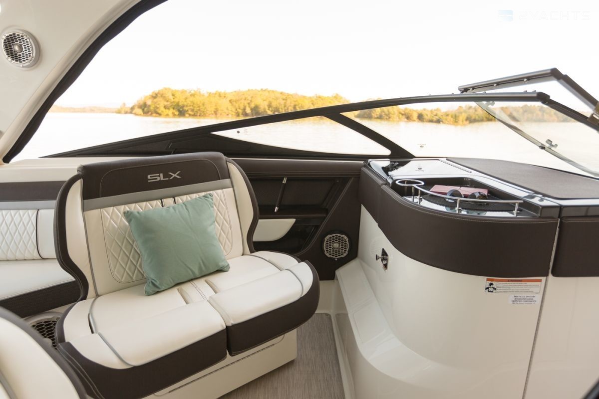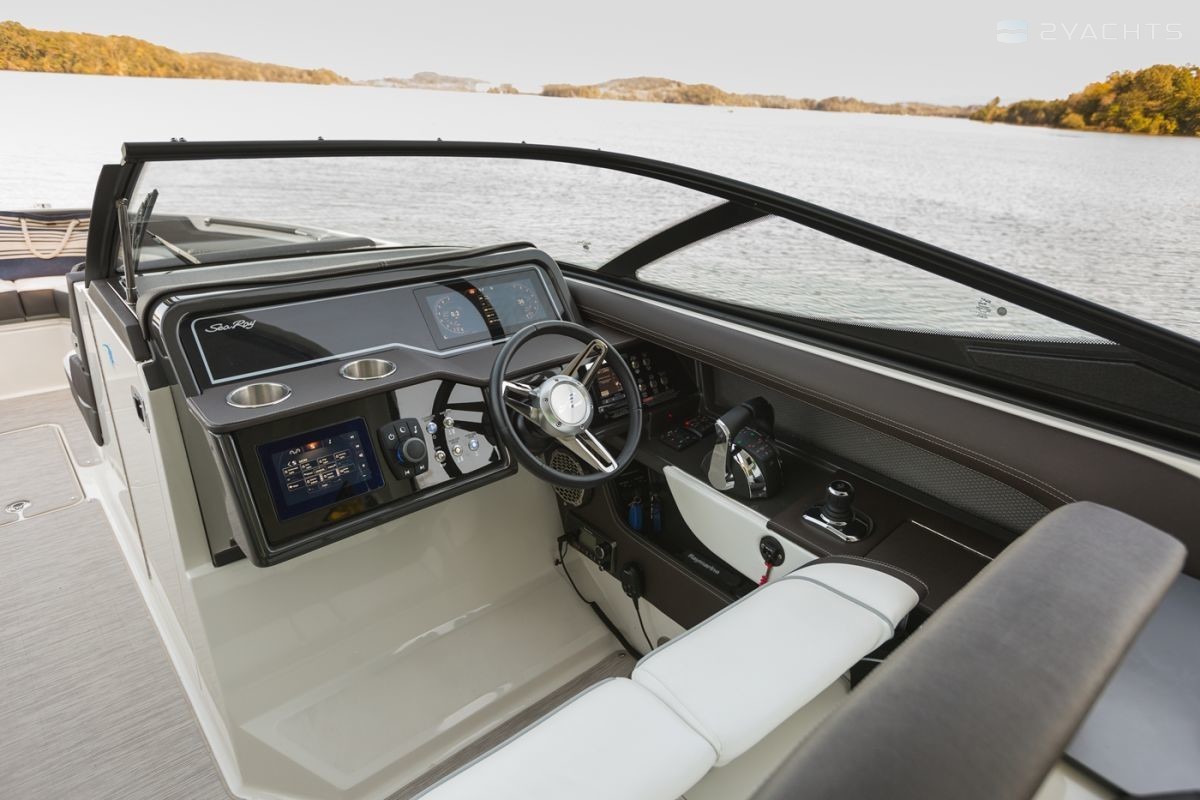 The bowrider Sea Ray SLX 310 is equipped with two Mercruiser outboard motors, ranging from 250 to 350 hp. The capacity of the fuel tank is 492 liters, and the water storage tank is 90 liters.