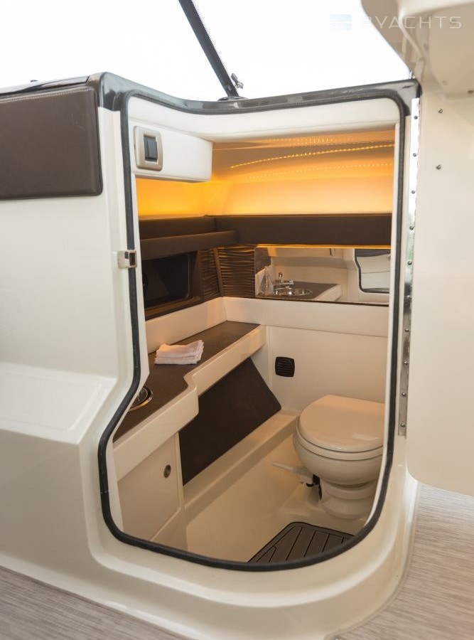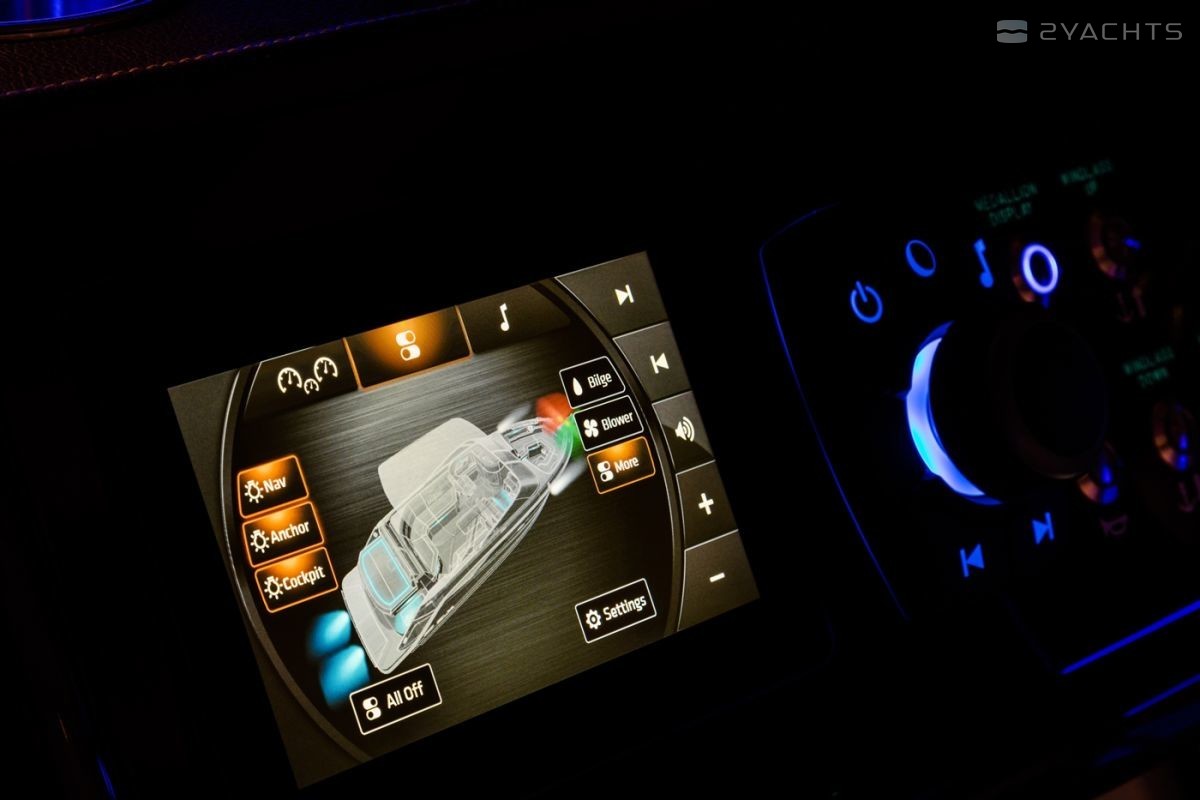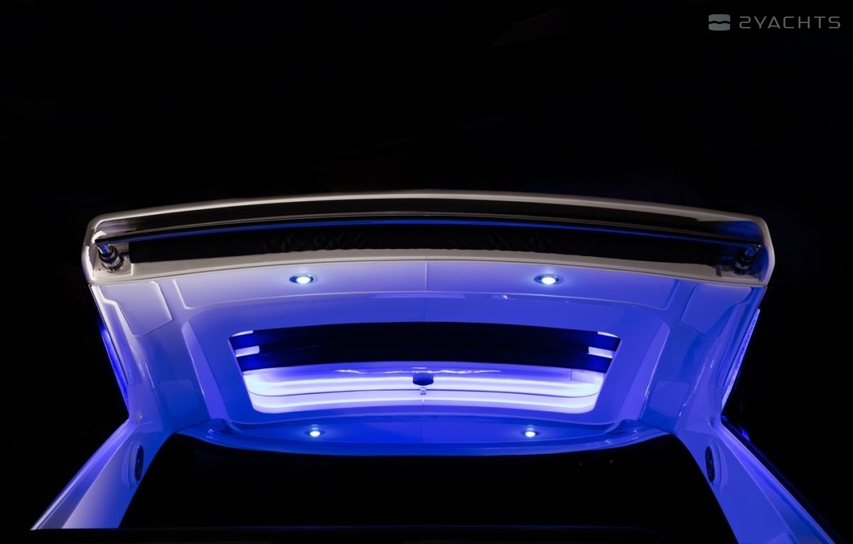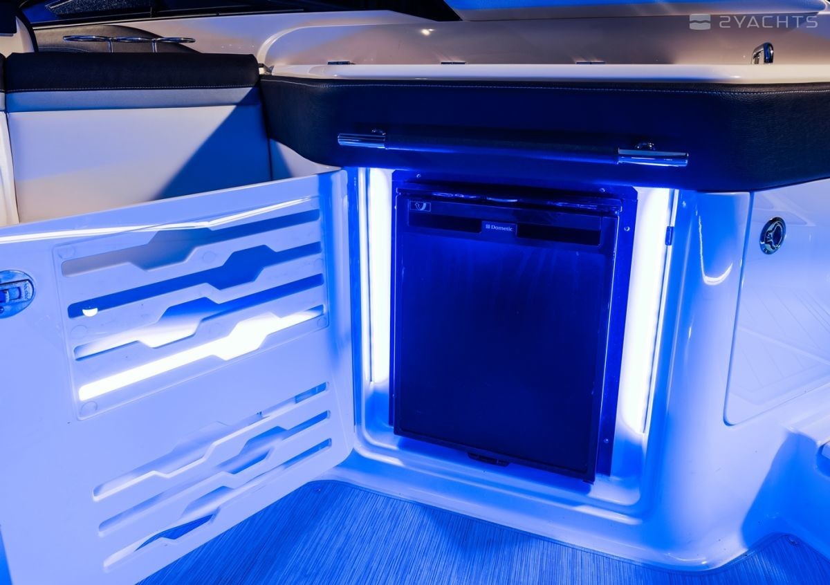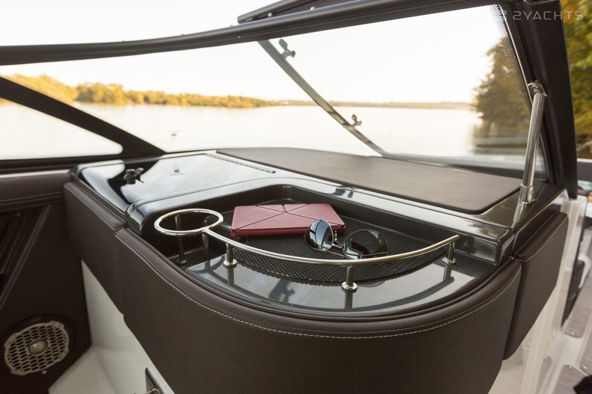 The bowrider Sea Ray SLX 310 is equipped with two Mercruiser outboard motors, ranging from 250 to 350 hp. The capacity of the fuel tank is 492 liters, and the water storage tank is 90 liters.