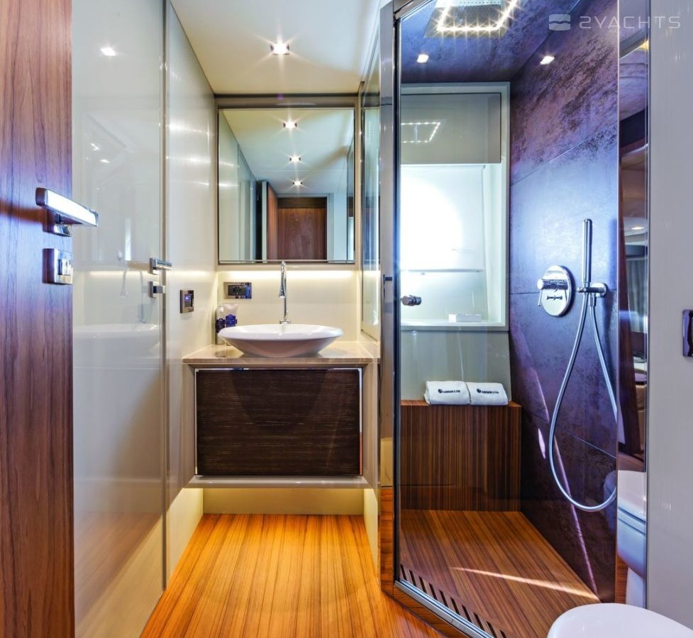 The dashboard of the yacht is equipped with a 15-inch display, a control joystick, autopilot, radar and steering wheel with a changed angle. All information about the condition of the vessel is displayed on a digital screen: speed and number of revolutions.