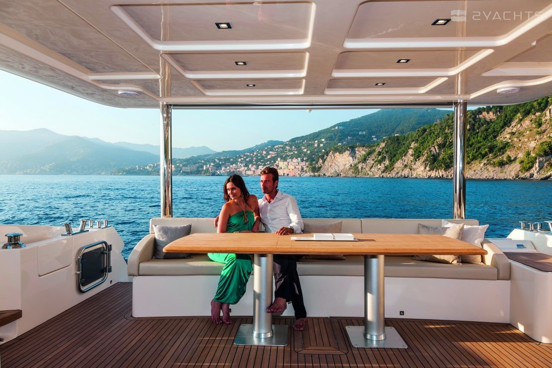 On the deck of the vessel, the rails are made of stainless steel, there are wipers on the windshield, and covers are provided on the side windows. In the bow of the yacht there is a dining area with a table, sofa, chairs and sunbeds with adjustable backs. Side walkways are made of teak with anti-slip coating, which ensures the safety of passengers and crew.