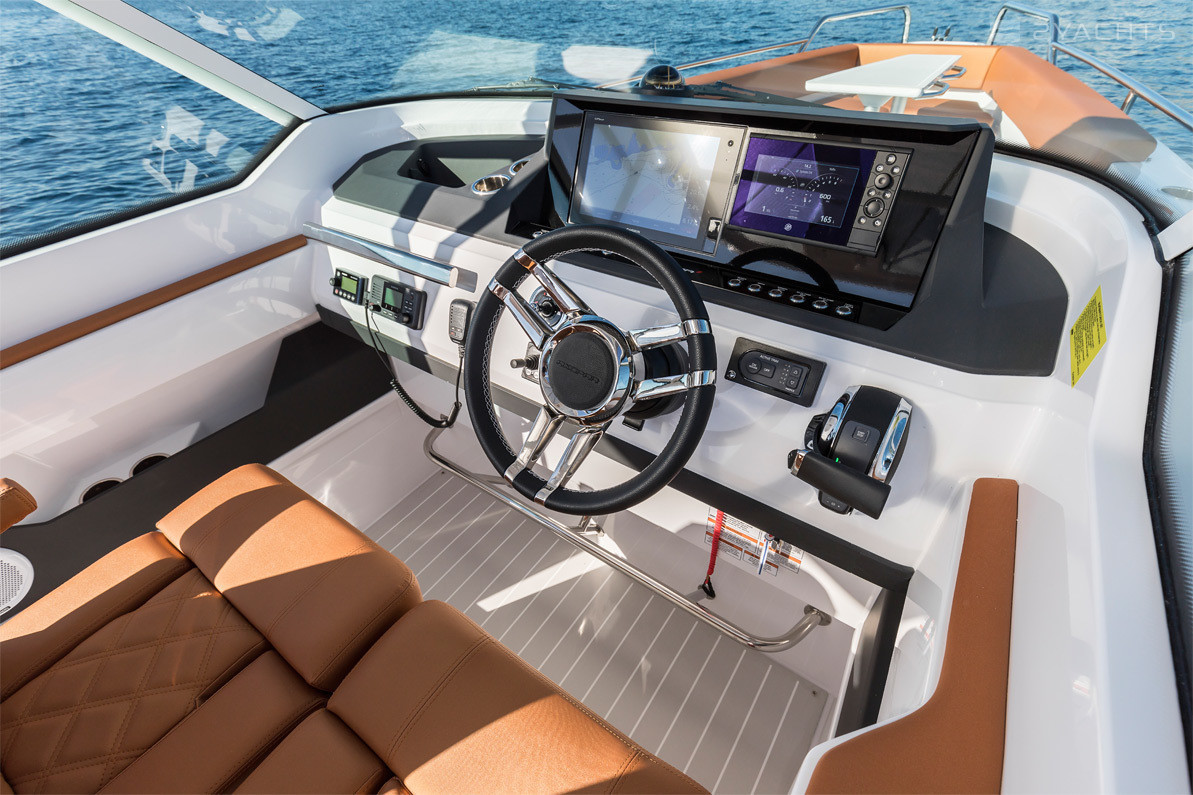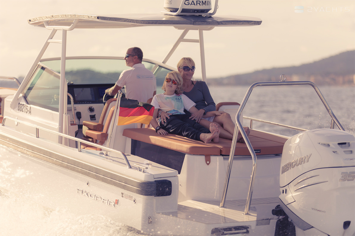 Behind the cockpit sofa Axopar 28 T-Top is a spacious sun lounger, aerator and a stern passage equipped with two platforms with a ladder for access to the water and a tow bar. The model is equipped with one 300 hp outboard motor. or two motors of 100 or 150 hp. Its cruising speed is 36 knots and its maximum is 49 knots. The fuel tank holds 260 liters.