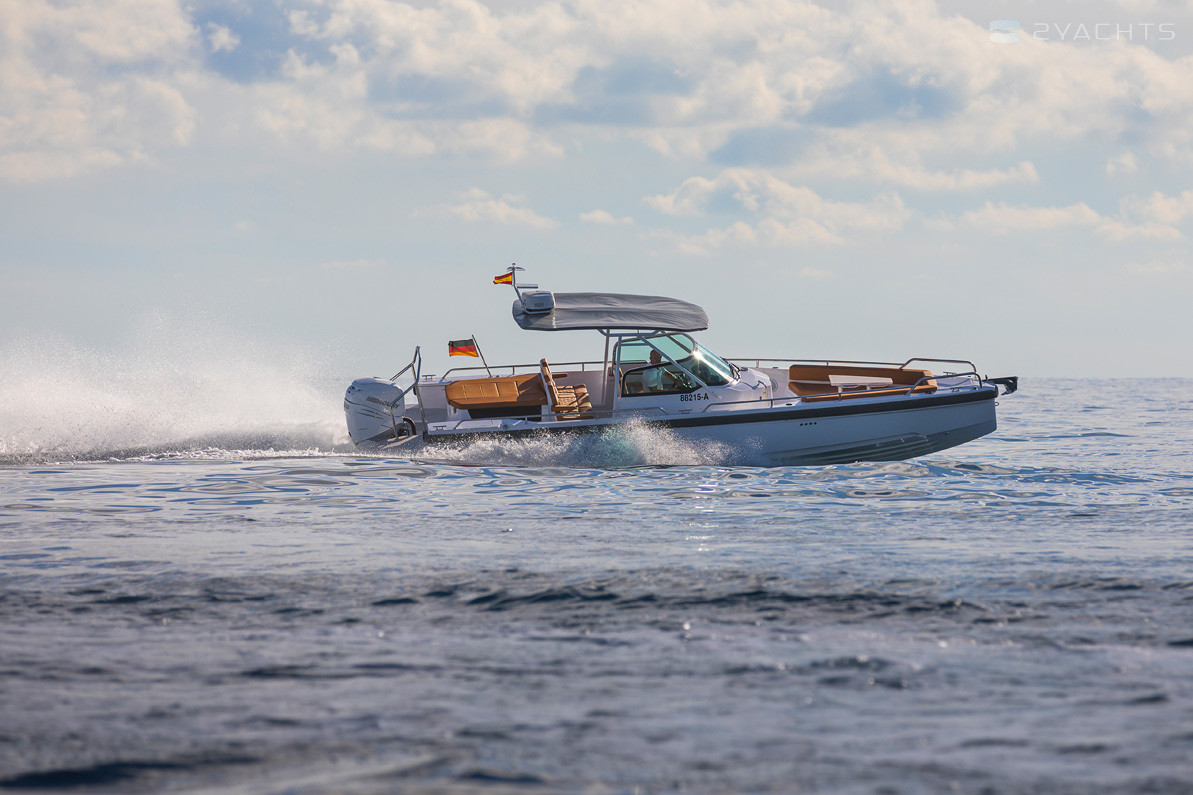 The Axopar 28 T-Top is a pleasure craft that has been in production since 2014. It is equipped with eight seats and two berths for passengers. The hull is made of fiberglass, its length is 8.6 meters, width - 2.85 meters, and draft - 0.75 meters. The model has international CE (B) certification and can be operated at sea, up to two hundred nautical miles from the coast.