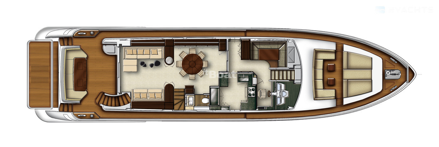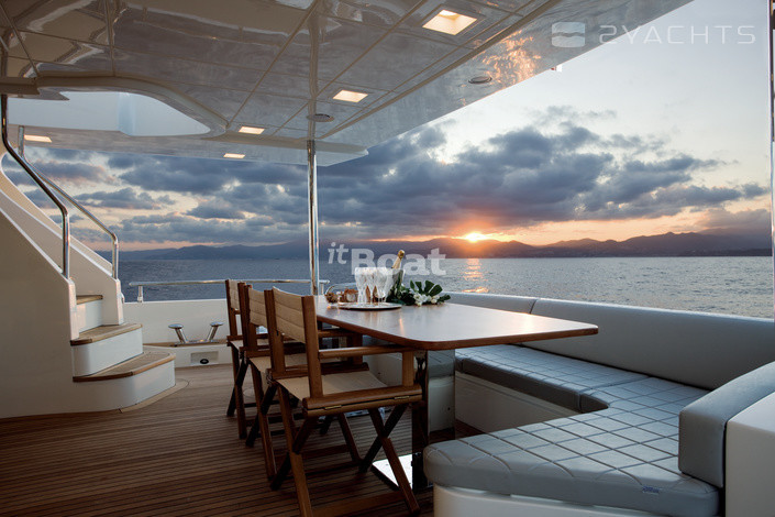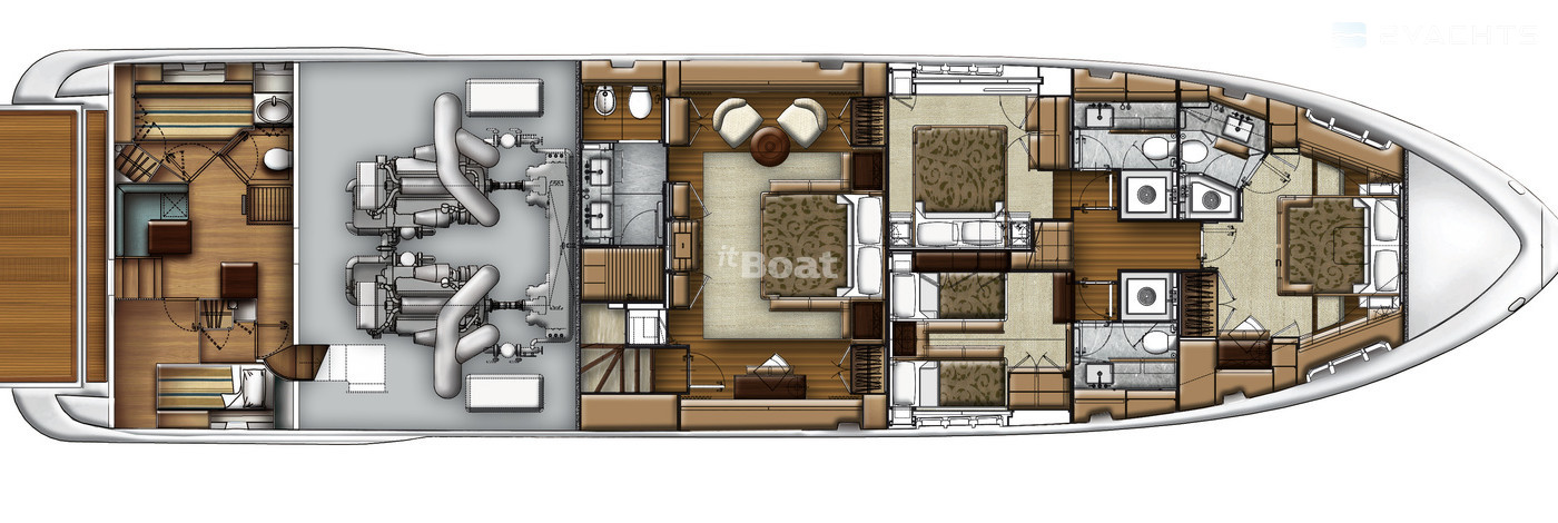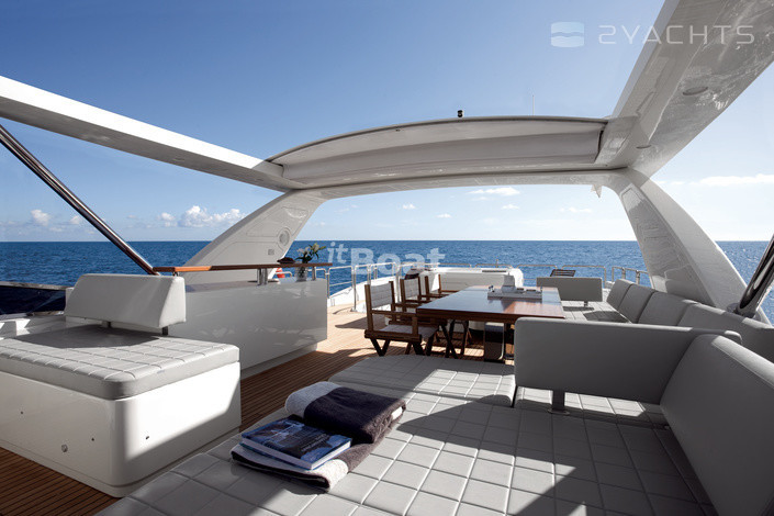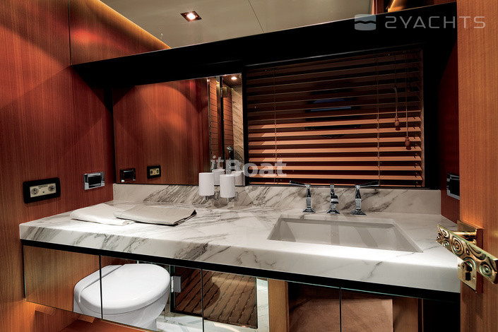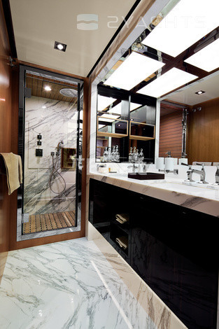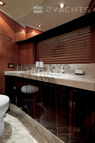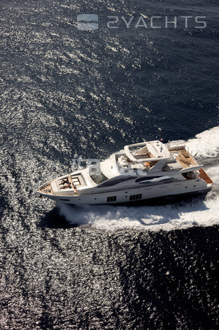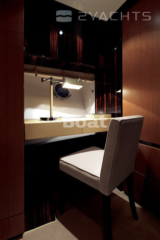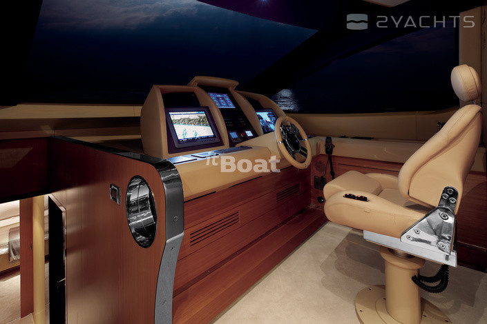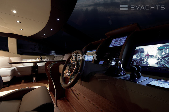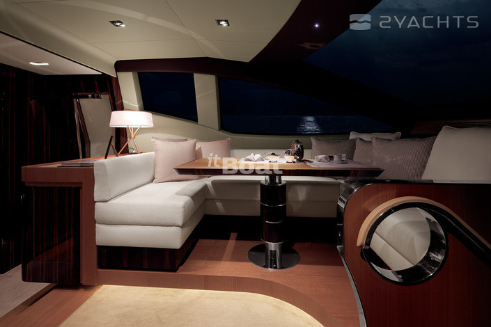 With his large frame and considerable displacement of this planing flybridge motor yacht is driven on smooth water, like a child's toy. Optional fin stabilisers do not allow the roll even in tight turns, however, when you want to drive from the soul, has to steer from the upper wheelhouse, as all-round visibility in the wheelhouse is limited.Covered flybridge with hardtop is almost half the length of the hull and along with the luxurious interior, the interior of which was designed by Stefano Righini is a wonderful place to stay. In the interior of this model is dominated by smooth lines without sharp corners and intense insulation of residential premises provides a quiet and relaxing atmosphere on the go. Given the large area of the panoramic glazing of premises and exceeding two meters height of the ceilings, the Azimut 88 is unlikely that someone will have a claustrophobic attack.