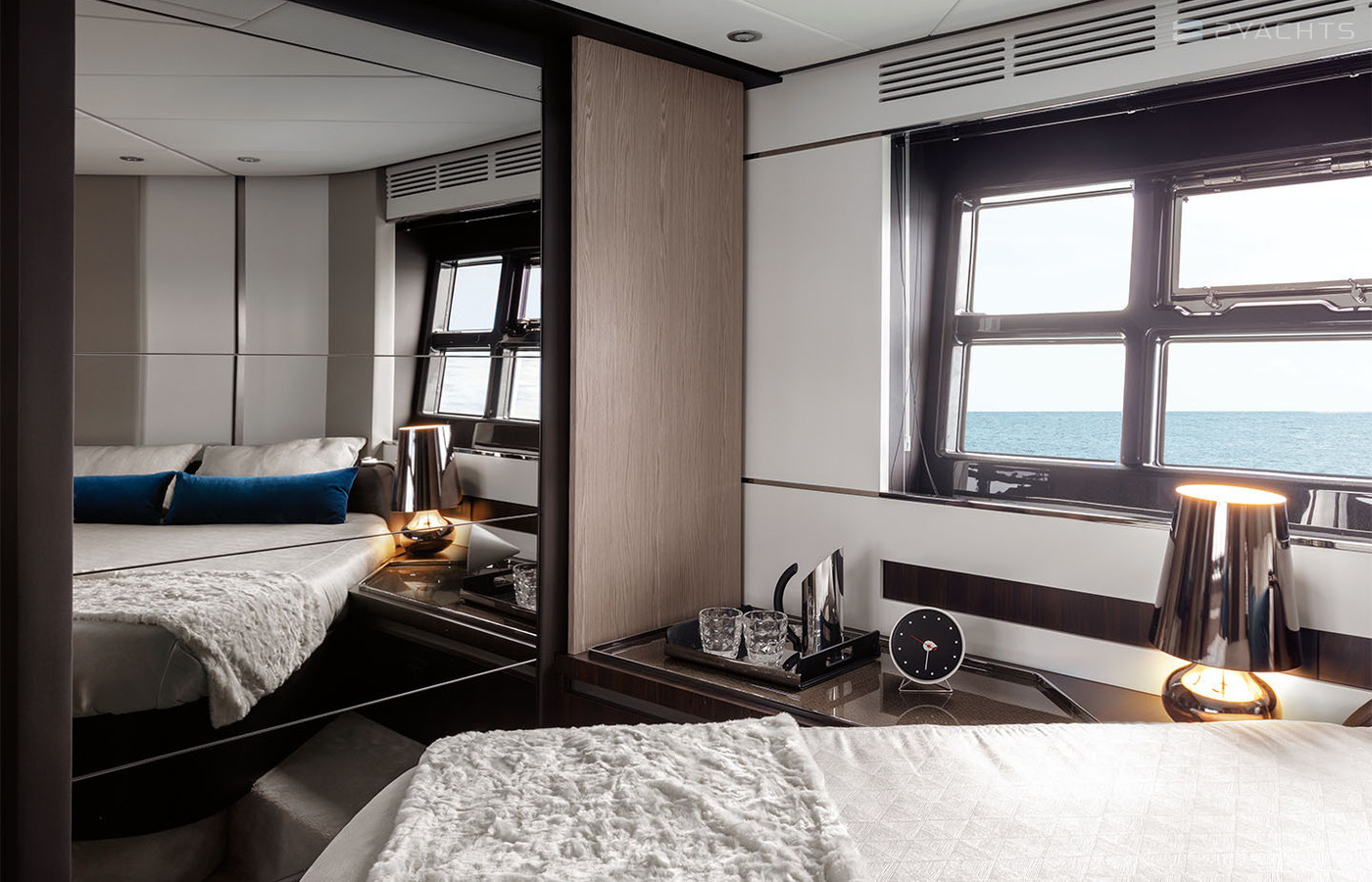 On the main deck there is a salon with a main control room, a sofa and a table, a galley equipped with a sink, a refrigerator, a bar and a stove. On the cockpit of this gliding yacht, there is a bathing platform, supplemented by a relaxation area with a corner sofa and a table, and the sundeck with sun loungers occupies the fore part of the mindeck.
