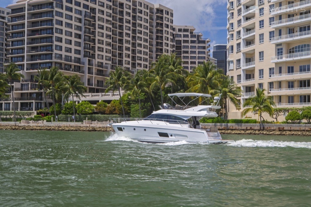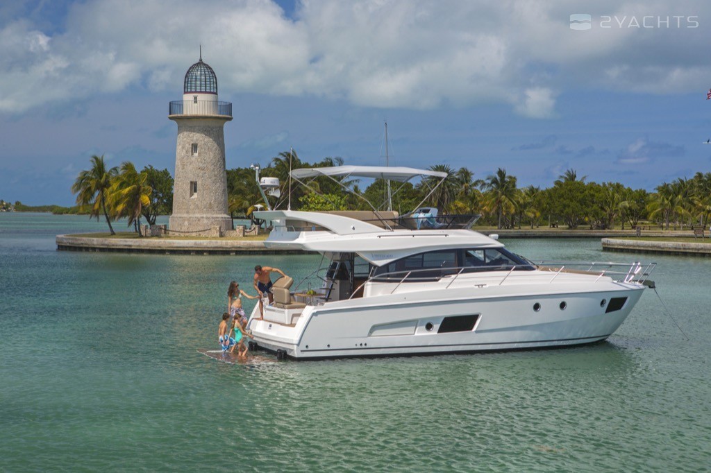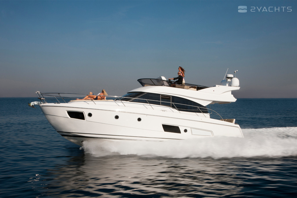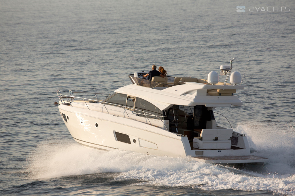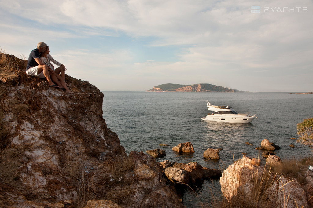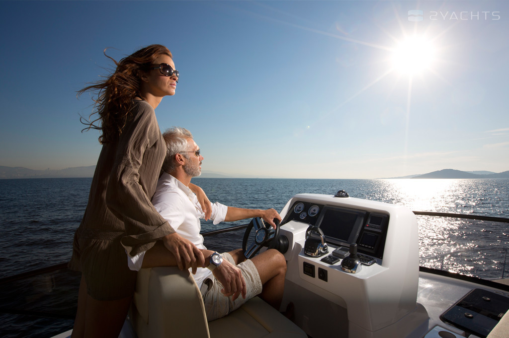 The largest flybridge in this class of yachts is equipped with a full control post, wide sunbeds and a folding bimini top. For relaxation, there are also sun loungers in the bow of the ship and a shaded terrace at the stern with a folding table and swivel sofas. Directly from the terrace you can go to the transom with a hydraulic drive, which provides safe access to water and, if necessary, can be used as a tender garage. In the salon there is a control post, a dining area and a kitchen with a stove, oven, grill, sink, refrigerator, as well as a place to store food stocks. For accommodation, three double cabins with two bathrooms are provided. In total, the yacht can accommodate up to 12 people.