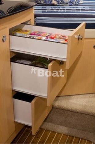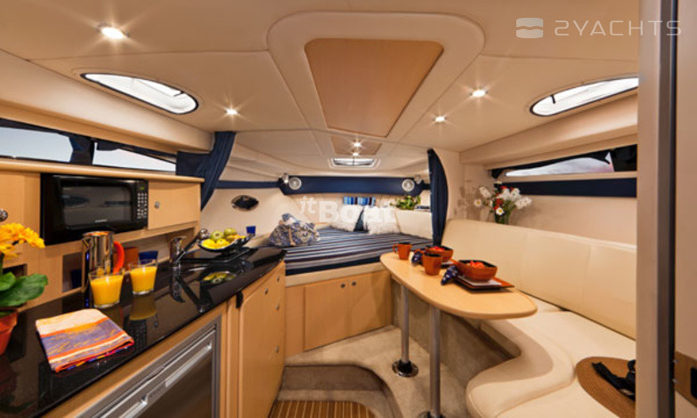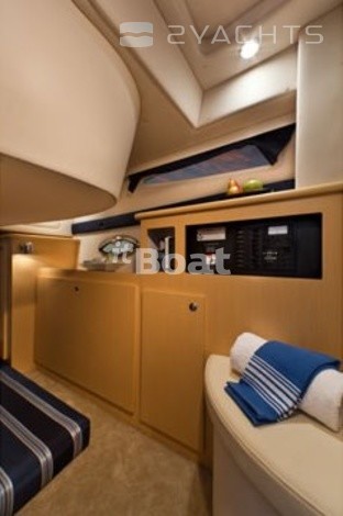 The yacht Bayliner 335 Cruiser is the flagship of the Cruiser line, but the whole model range of the company. Matching this title, the boat offers the owner and his guests the maximum comfort level on Board. This is especially noticeable in the aft cabin with loads of cabinets, stretched across the left side. Radically changed the layout of the cockpit, where on the left side, a large sofa, convertible aft sunbed in the sun. To starboard behind the sofa is a large steering wetbar with a sink, a fridge, a locker and a compartment for trash. The swimming platform for a fee is supplied with an extension that more than doubles its area, and in the transom for the cap hides a compartment where you can put fenders. In the compartment there is a main fuse box, but that's fine because all the electrics meet the standard of IP67 waterproof. As befits a flagship, dynamic characteristics of the Bayliner 335 Cruiser to satisfy the ambitions of the owner. With two petrol 300 HP MerCruiser 350 MAG boat develops quite a decent speed 42.7 node. And with the diesel CMD QSD 4.2 L 270 forces the maximum speed is "only" 38.5 knots, but the autonomy is increased by half up to 375 kilometers.