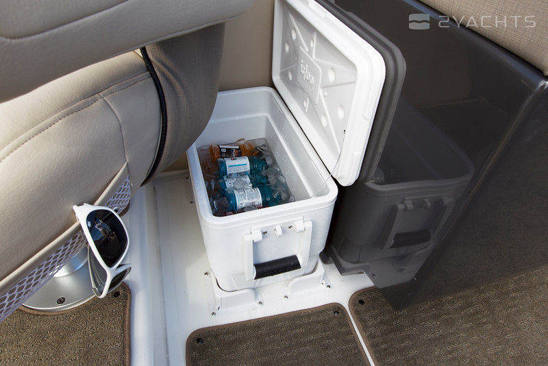 Behind the manager's seat is a portable refrigerator, and to the left of it there is an exit to the open nose with a septum. On the bow of the ship are two sofas for three passengers. Bayliner Element XR7 comes with a removable high awning that can hide all parts of the ship from the sun.