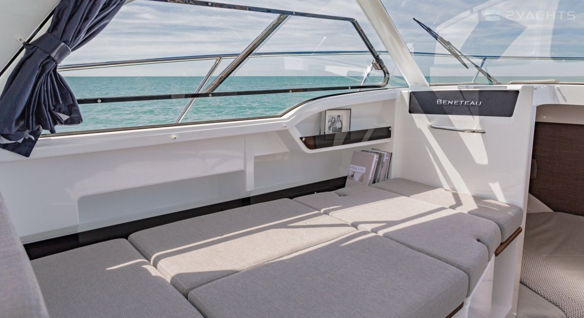 The upper deck of the boat is formed by a closed saloon with a helm station and a dining area consisting of a sofa and a table that can be transformed into a full double bed. The cockpit also has a dining area that can be converted into a lounger. Opposite the sofa in the saloon is a compact galley equipped with a stove, sink, oven, mini-fridge and microwave oven. On the starboard side, you can go to the swimming platform with a retractable ladder.