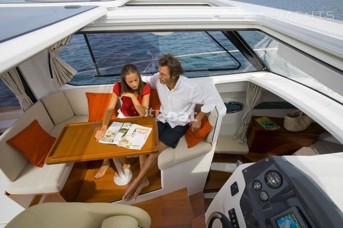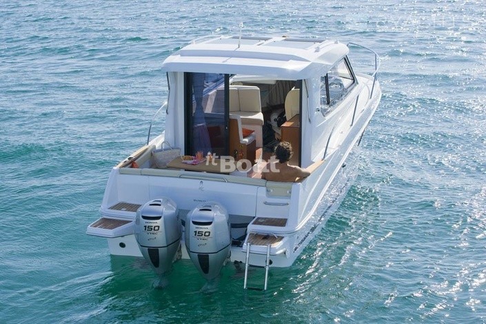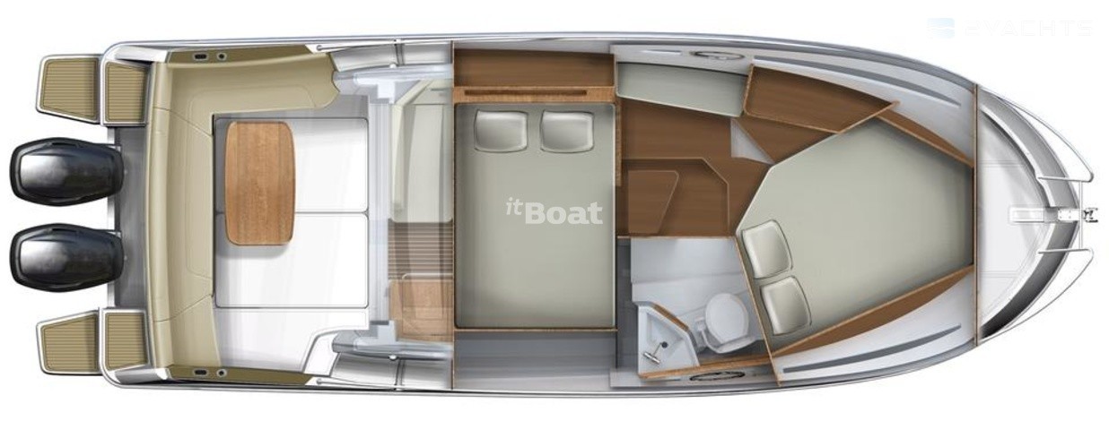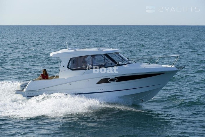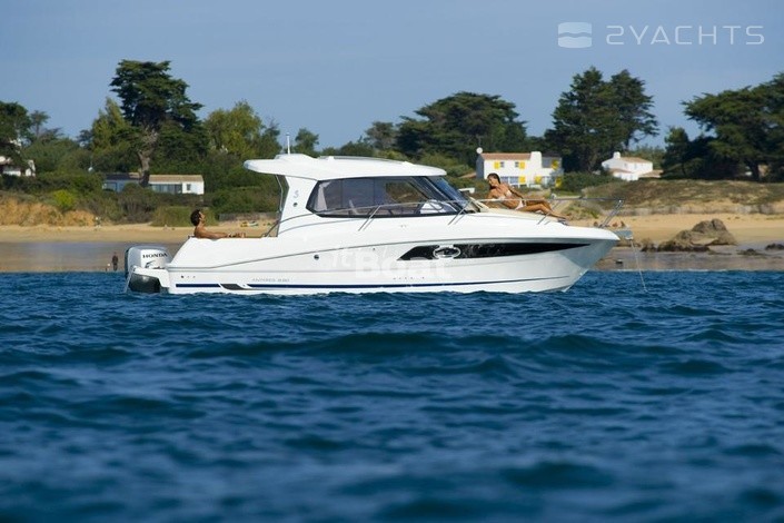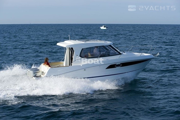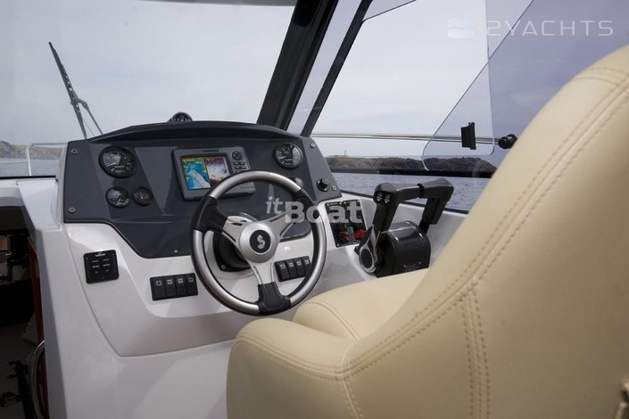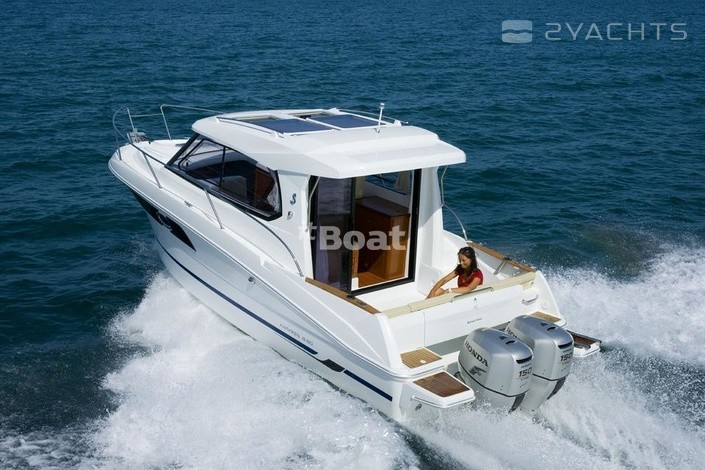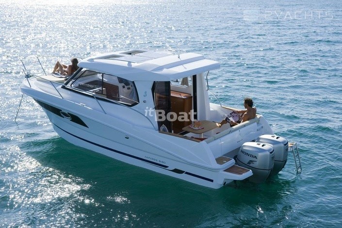 The flagship in the line of cruisers a series of "point eighty" is a Beneteau Antares 8.80, in 2011, became a new word in the design of such boats. This is today, this boat produces a lot of shipyards. Jeanneau, Flipper, Quicksilver and others began to build a family cruiser with a length of 8.5 — 9 meters with two sleeping cabins and outboard motors. But Antares 8.80 was first! Made by the shipyard in 2013, restyling, expressed in gray-beige the roof superstructure, gave the appearance Antares 8.80 a little more ease and sophistication. In fact, as the rest of the boat company with "dot and eighty". But dynamic quality is much better 8.80 younger counterparts. Under one 250 HP engine, cruising speed is 23 knots, and a maximum in excess of 30 knots. This contributes not only engine power, but the Beneteau patented AirStep system, first used on the models Antares. In addition to the 250-horsepower motor, the Antares 8.80 boasts a full sized master bed, 2×1.5 m, located in the bow of the boat, and a guest bed with a width of 1.4 meters placed across the hull under the cabin. Beds separated by a small couch. Also on the lower deck is a spacious head with sink, shower and elegant wooden framed window. Wood enough in the design of the salon. In particular, the whole galley sewn veneer.