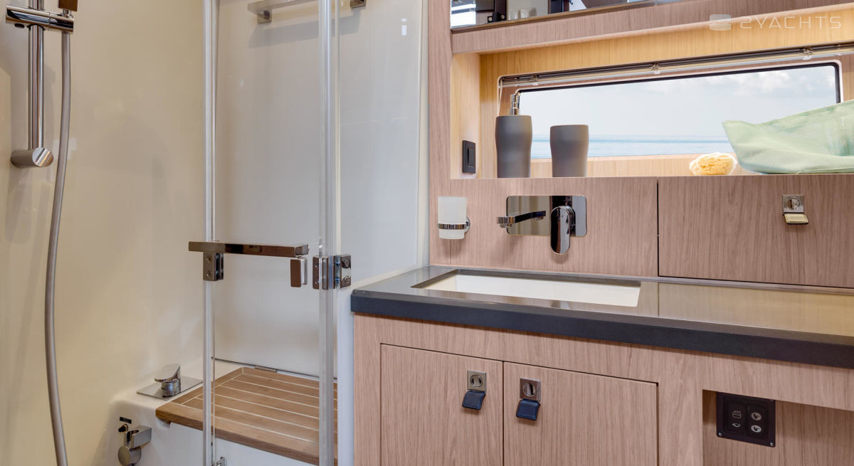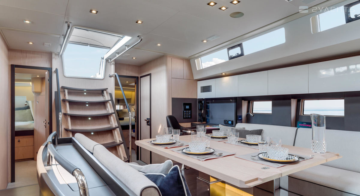 A cockpit door leads to the Beneteau Oceanis Yacht 62 main stateroom, equipped with an electronic control panel, two plush sofas, a wooden dining table, and a galley with sink, oven and microwave oven, food / crockery drawers and refrigerator. Behind the entrance staircase and in the bow of the ship are sleeping cabins, each with beds for two people, spacious lockers and separate rooms with bathrooms and showers.