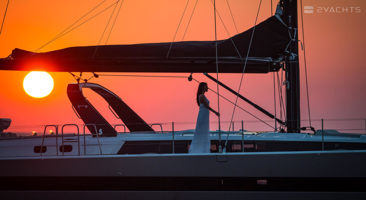 The captain's post is located on the cockpit - it is equipped with electronic displays and a soft sofa. In front of it there are two more sofas equipped with spacious lockers, as well as two compact folding tables. Along the sides, there are passages to the open bow platform, where several soft sunbeds are installed. At the stern of the yacht, there is a retractable platform with a folding ladder for access to the water and an attachment for towing.