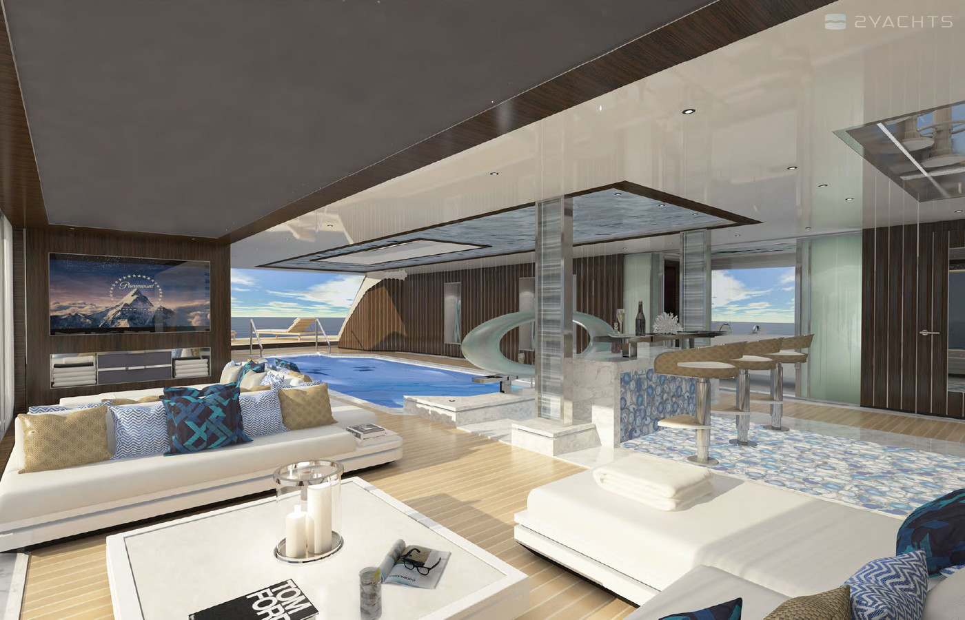 Emrecan Özgün, the CEO of Unique Yacht Design, says “Both exterior and interior areas of Bilgin 263-II are full of surprises. To me, the most attractive area is the beach club itself. While designing the yacht, we placed all the tenders and sea toys on the front deck. This is how we managed to connect the beach club with the main saloon. With its 8.50-metre length and 1,40-metre depth, the eternity pool creates an enjoyable atmosphere while offering a relaxing place to socialize with friends.”