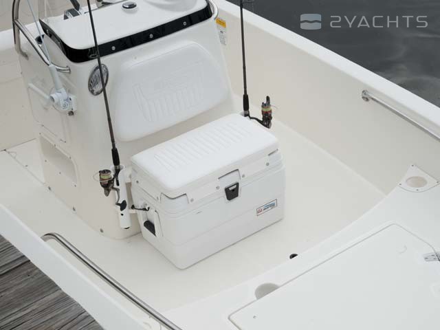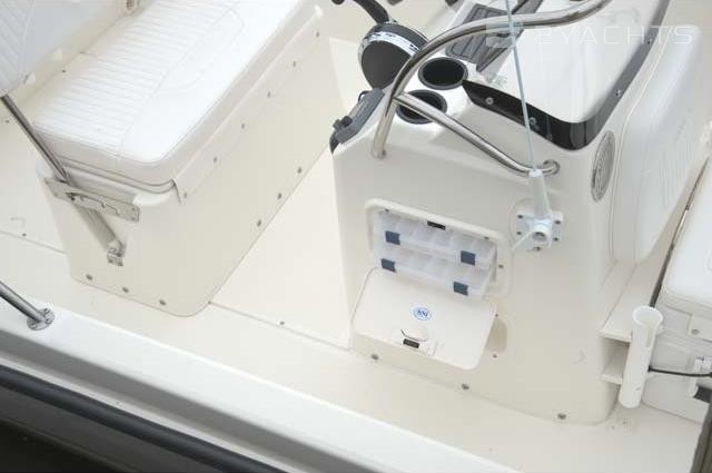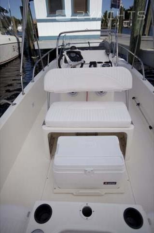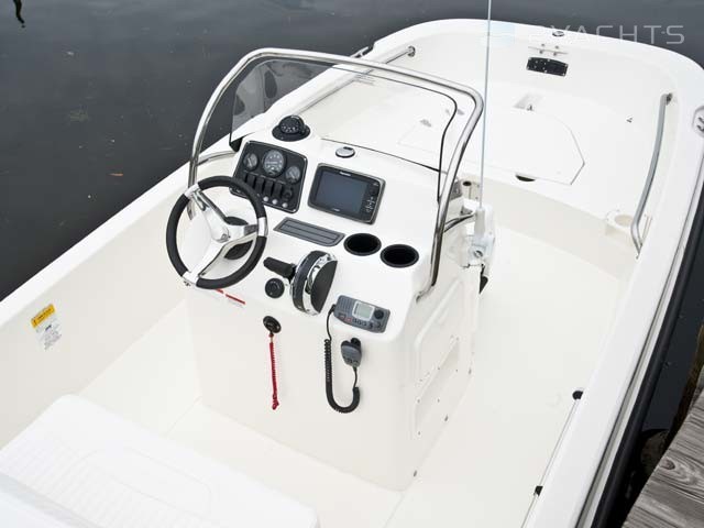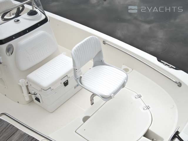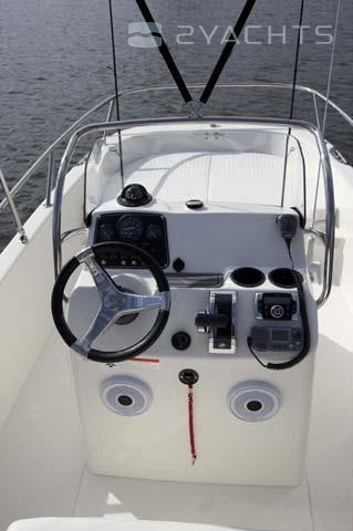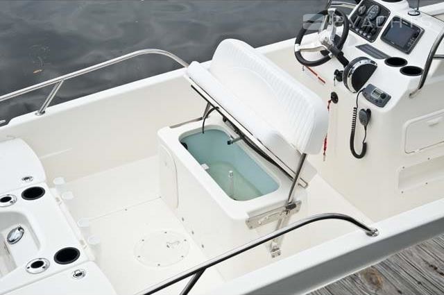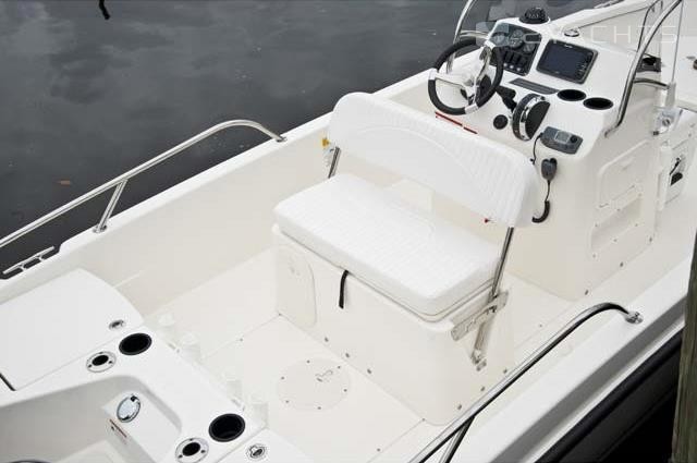 The captain's post is located on the cockpit of the boat. It is equipped with a control panel with an adjustable steering wheel and two drawers for personal belongings, as well as a two-seater sofa with a movable back and an integrated drawer for personal belongings. The owner can install a removable arch with a folding awning that covers the cockpit from the sun. It is included in the basic package of the Boston Whaler 170 Dauntless.