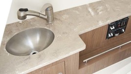 On the boat's cockpit, on the starboard side, there is a control post with an electronic console, an adjustable steering wheel and a movable captain's chair. Behind it there is a summer kitchen equipped with a sink, a refrigerator, a retractable worktop and a barbecue. On the port side there is a bathroom with a washbasin, a convertible seat for several passengers with a compact table and a soft sofa. A hard roof is installed above the cockpit with a retractable awning that covers it from the sun.