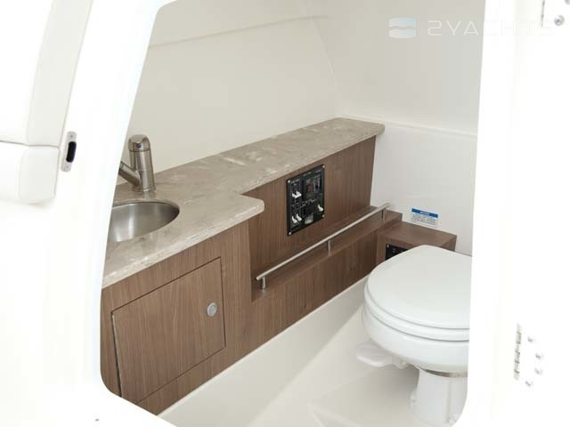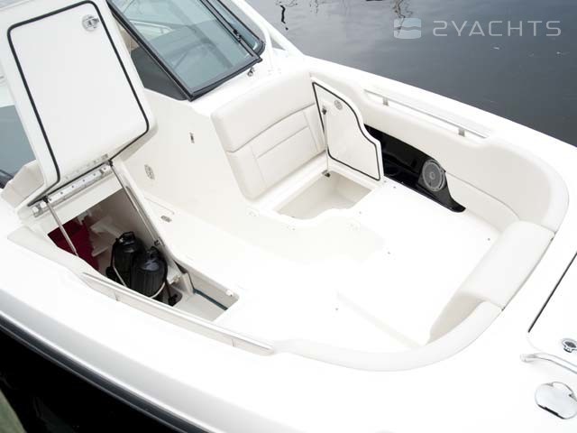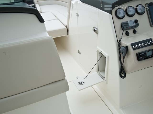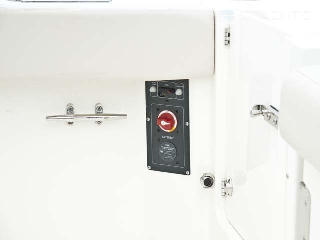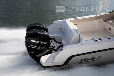 You can go to the stern through a small passage next to the sofa. It has a platform for access to water and four fishing rod mounts. The Boston Whaler 270 Vantage is equipped with an installation of two outboard motors rated at 150, 200, 225, 250 or 300 hp. The fuel tank of the vessel holds 622 liters, the water tank - 76 liters. The cruising speed of the vessel is 22 knots, the maximum is 38 knots.
