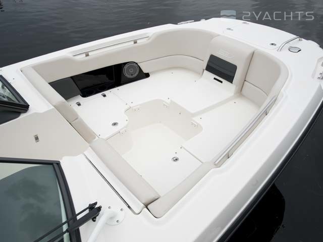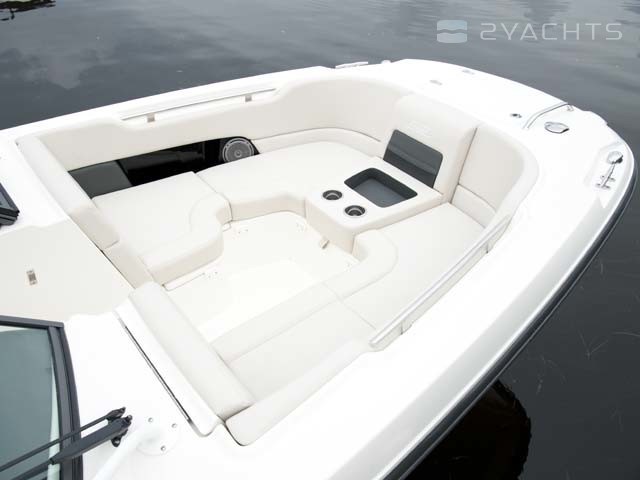 The model refers to the type of “bow rider”, as it has an open nose with seats for several people. It has two corner sofas that can be transformed into sunbeds for sunbathing, as well as a compact retractable table. You can enter the bow of the vessel through the passage in the windshield.