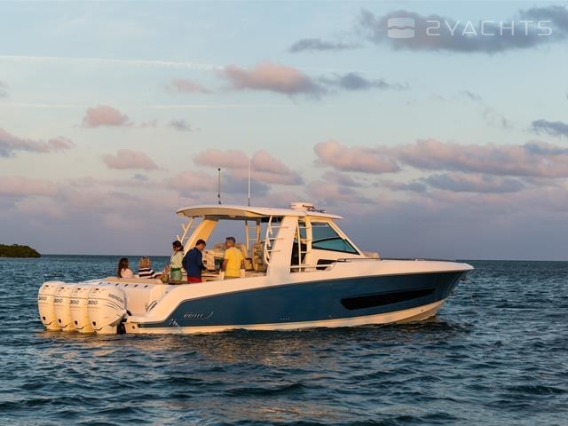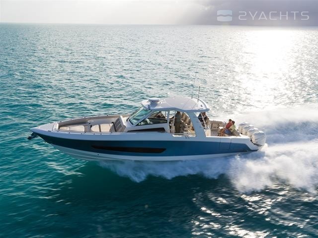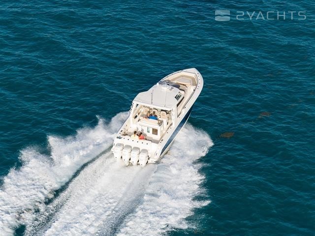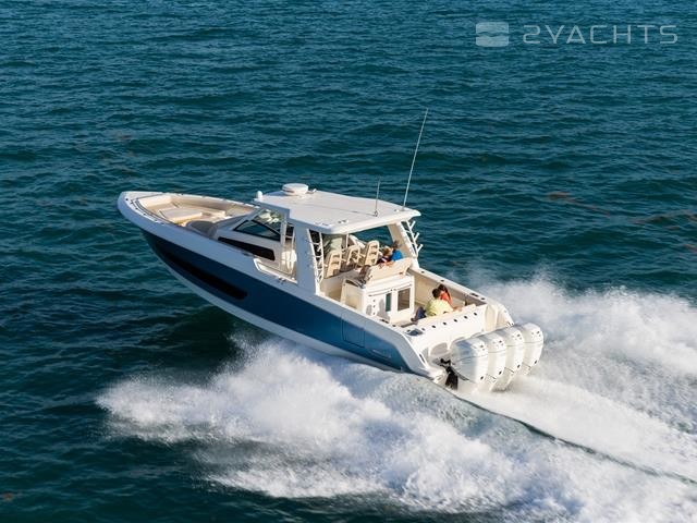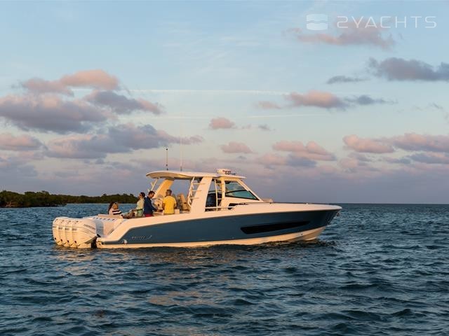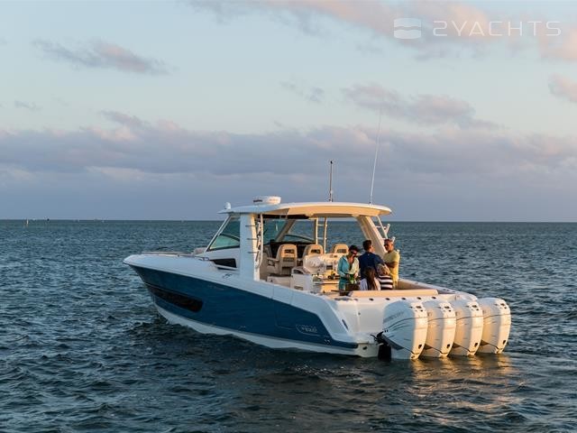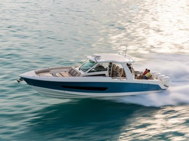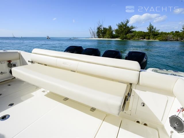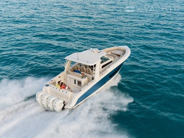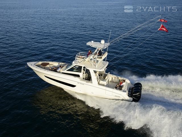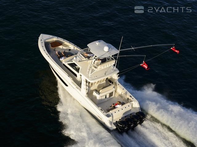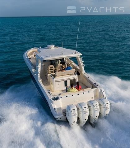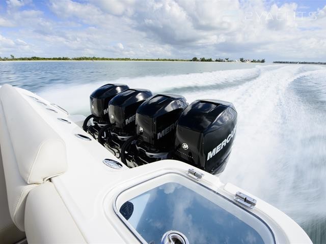 The Boston Whaler 420 Outrage is equipped with four 350 horsepower outboards. The capacity of the fuel tank is 2,271 liters, and the water tank is 227 liters.