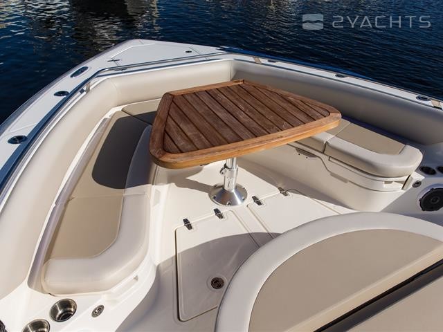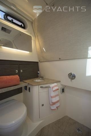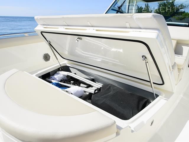 Bowrider has an open bow platform equipped with two sofas, one of which can be transformed into a double lounger, a folding table and a spacious locker mounted on the floor. Mounts are provided for a removable tent covering it from the sun. You can enter the boat’s nose from the cockpit, through the passage on the port side.