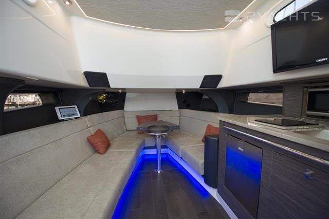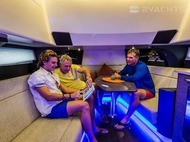 A hard roof is installed above the cockpit, on which a removable viewing post with a soft sofa is mounted. Inside the cockpit there is a control panel with several electronic displays and an adjustable steering wheel, as well as two rows of seats for passengers. The feed is equipped with a galley with a barbecue, a sink and food drawers, as well as a platform for access to water with a compact staircase on the port side. In the cabin of the vessel there is a corner sofa, a wardrobe, a kitchen with a sink and an oven, a TV, as well as a separate room with a bathroom and a shower.