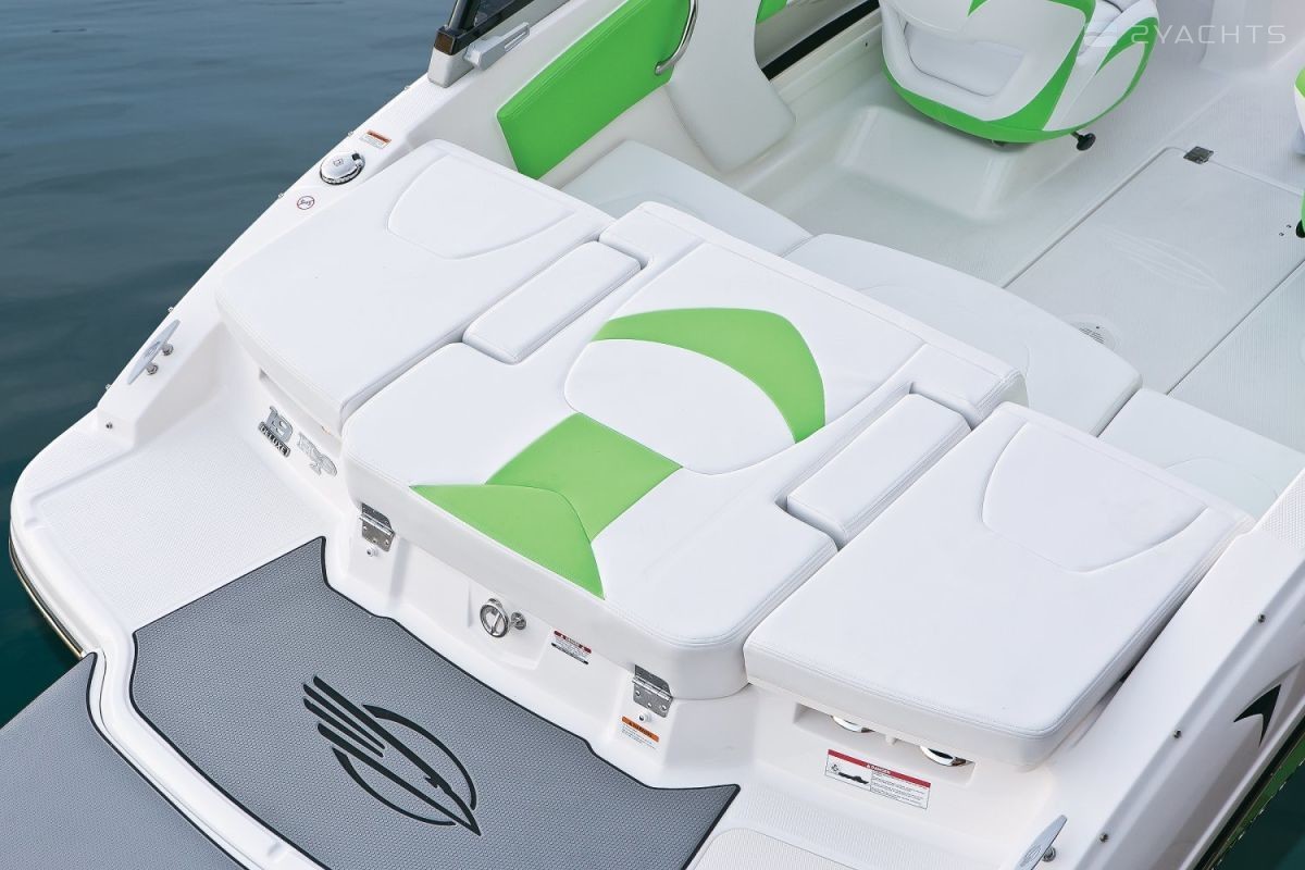 At the stern of the cockpit there is a bathing platform with a folding ladder for launching into the water. On the cockpit is a sofa, a top-loading refrigerator and two lockers for storing rescue equipment. A dining table can also be provided. At the control post of the Chaparral 19 H2O Sport, two seats were mounted for the captain and the steering. On the dashboard there is a steering wheel with hydraulic booster, tachometer, speedometer, fuel level sensor and a reverse gas switch. Between the seats of the helmsman and the captain, a passage to the bow area, where two sunbeds are installed.