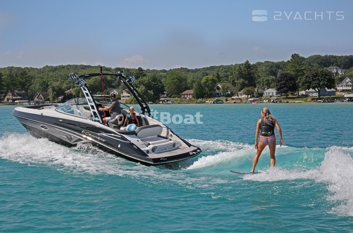 The model is equipped with a digital control panel, charger, navigation lights and an echo sounder with an indicator of air and water temperature. All information about the status of the Crownline E 255 Surf boat is displayed on the dashboard: speed, number of revolutions and oil pressure level. The boat has a ballast system: 3 bags with a total weight of 680 kilograms.
