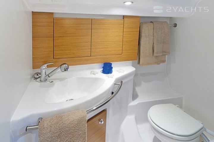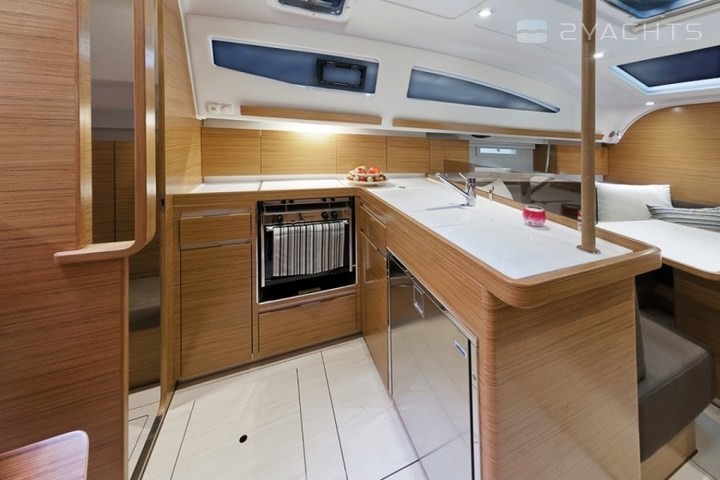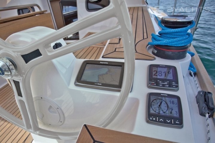 For relaxation, there are sun loungers at the bow of the vessel and a Mediterranean cockpit at the stern. The cockpit has several seats, a fold-out table and a small grill area with a sink and refrigerator. The helm station is equipped with two steering wheels, which allows you to take the best position regardless of the tack. The salon has a spacious dining area with a TV, a small work area and a kitchen with a stove, double sink, oven, large refrigerator, and storage space for food supplies. The yacht has two or three double cabins with two or three bathrooms, respectively.