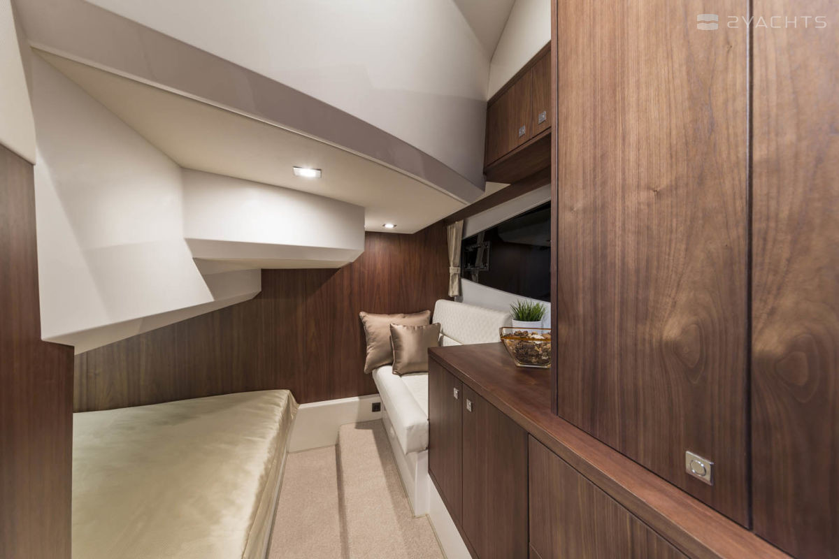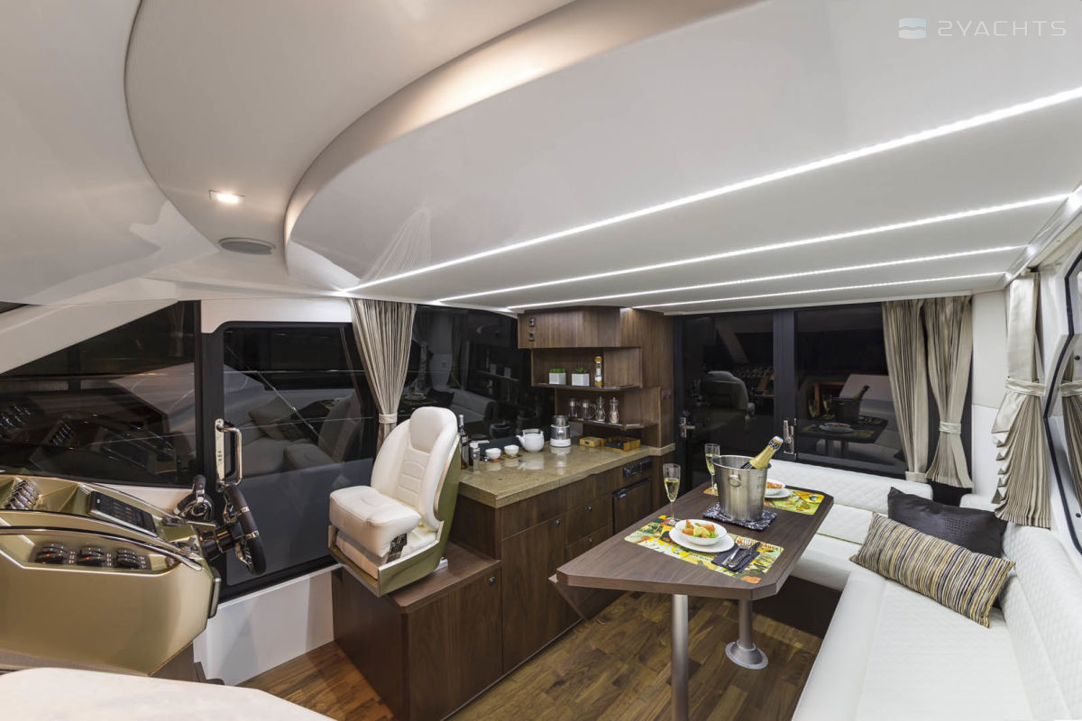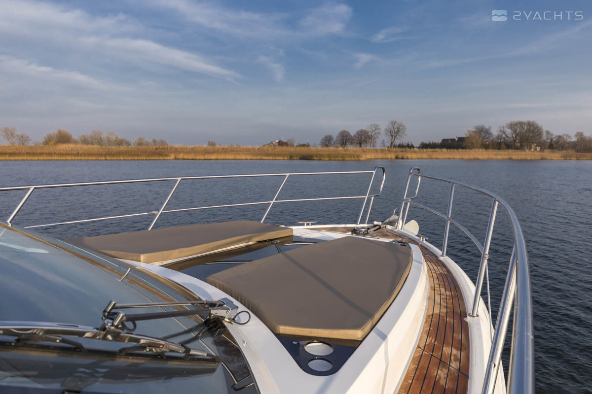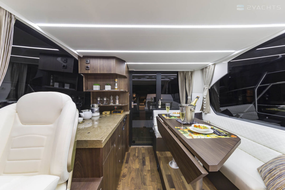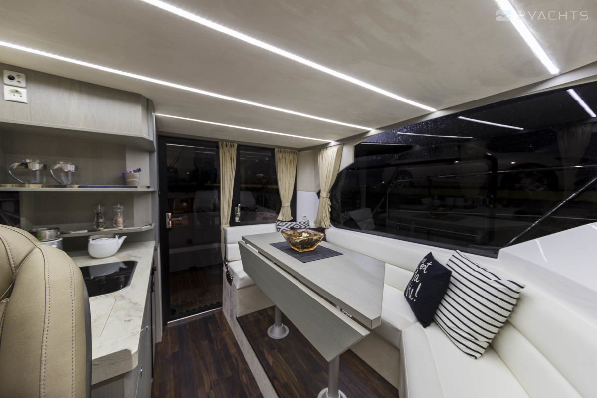 Yacht Galeon 360 FLY belongs to the lineup of 2016 and was presented in Cannes a year earlier. Designer Tony Castro succeeded in a symbiosis of sporty style and panoramic glazing of a large area of high sides. The yacht is available in flybridge or hardtop versions. Possible variation with sliding doors in the stern. The “coupe” option hermetically closes its space and allows you to make sea voyages not only in warm waters.