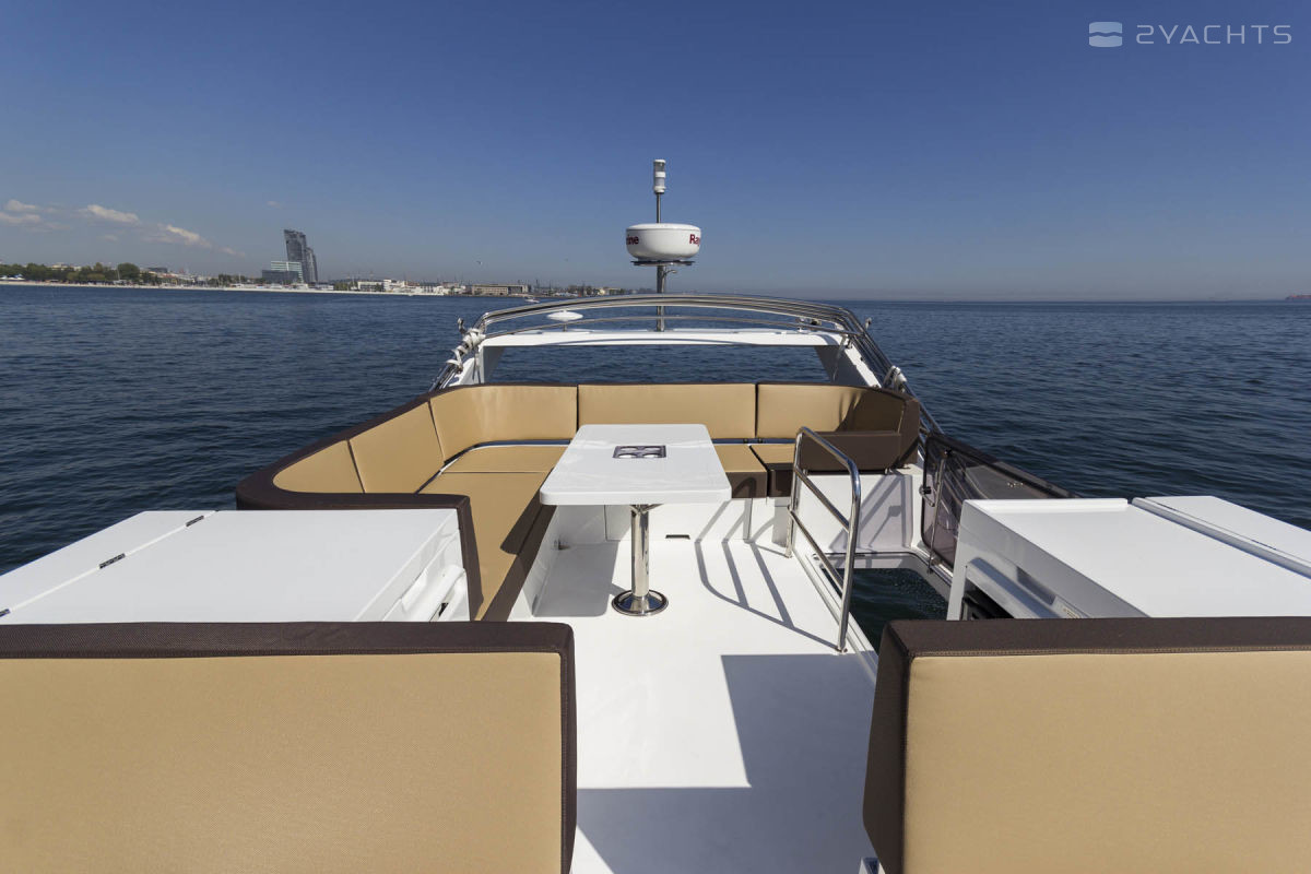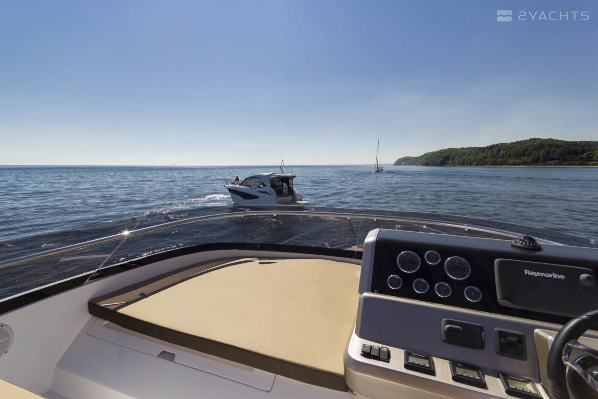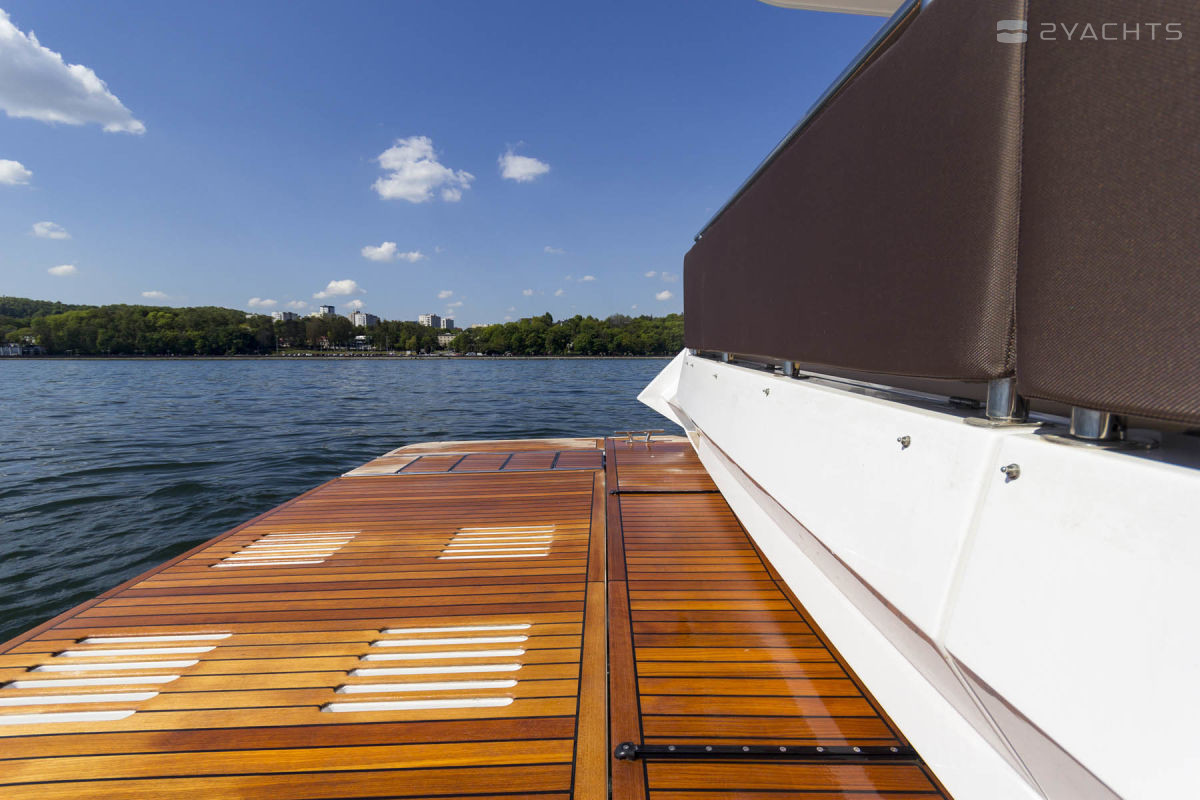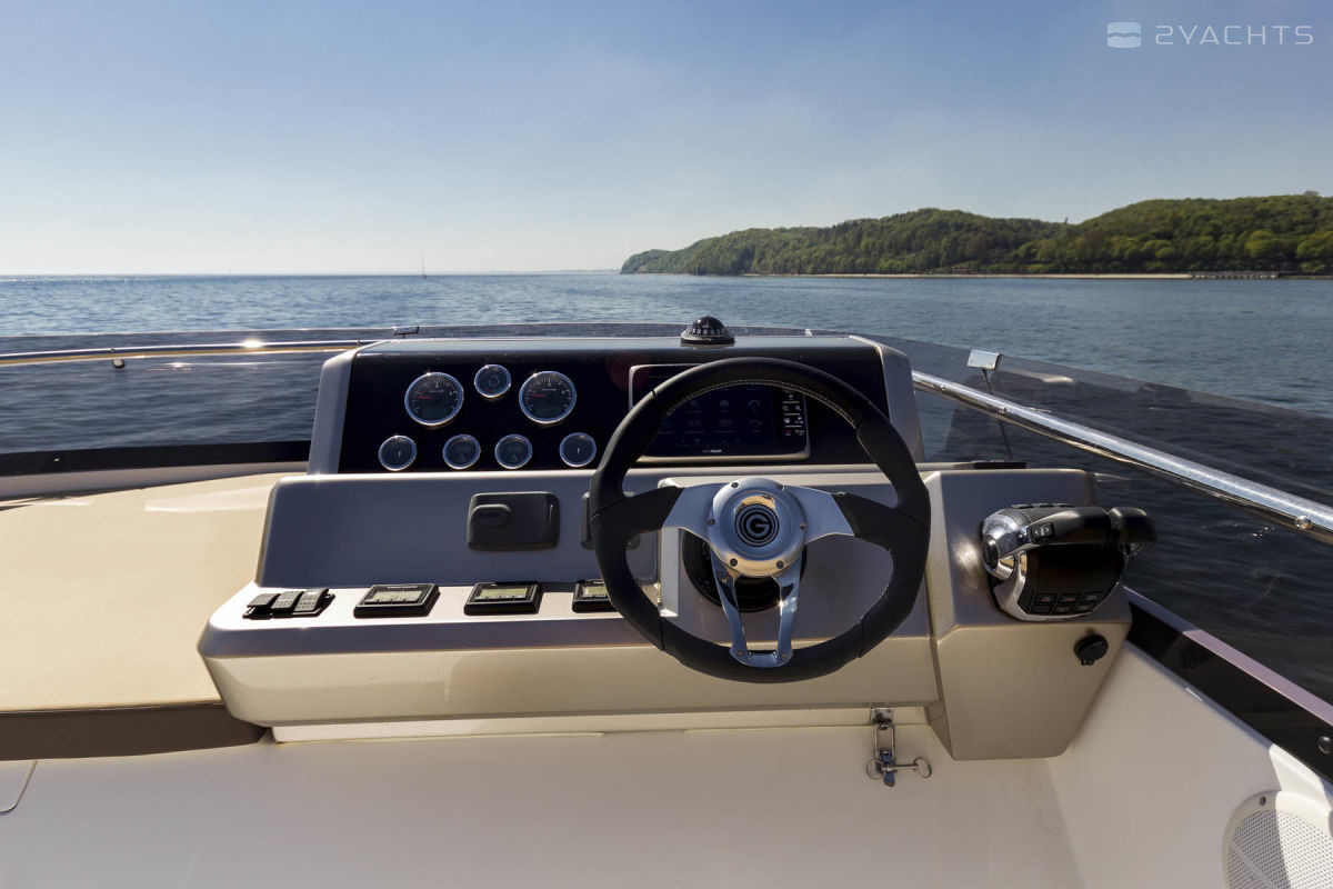 The standard power plants on the Galeon 420 Fly are two 435 hp VOLVO PENTA 2 X D6-370 DPH engines. At a cruising speed of 30 knots and with a fuel capacity of 1200 liters, it makes sea crossings of 200 miles.