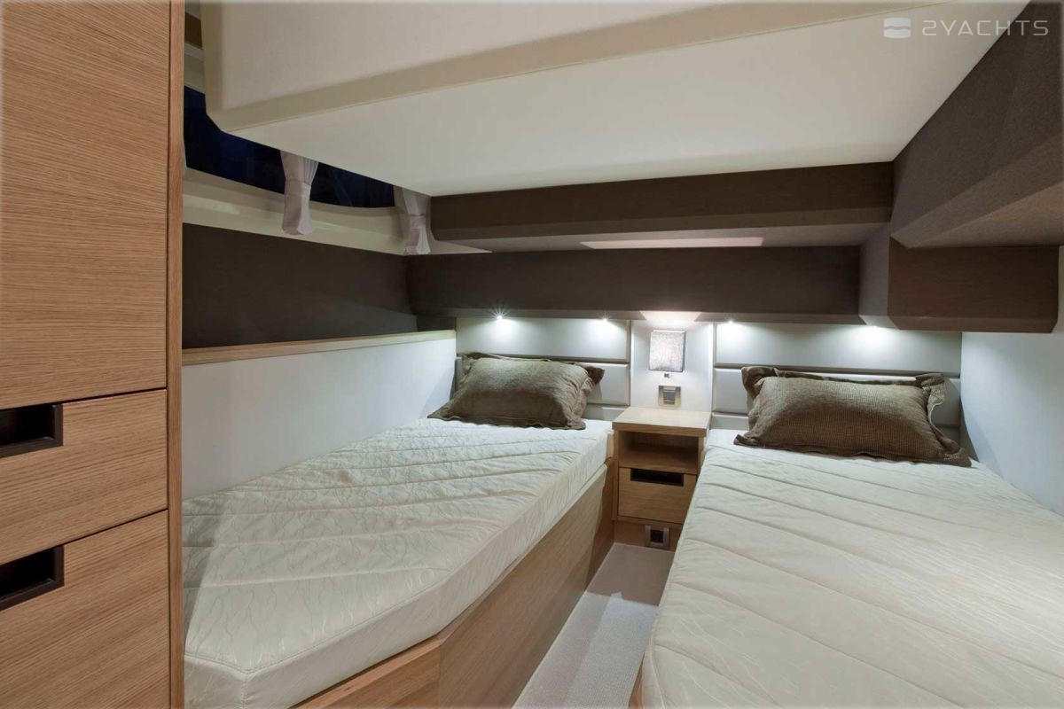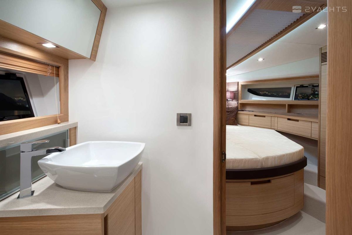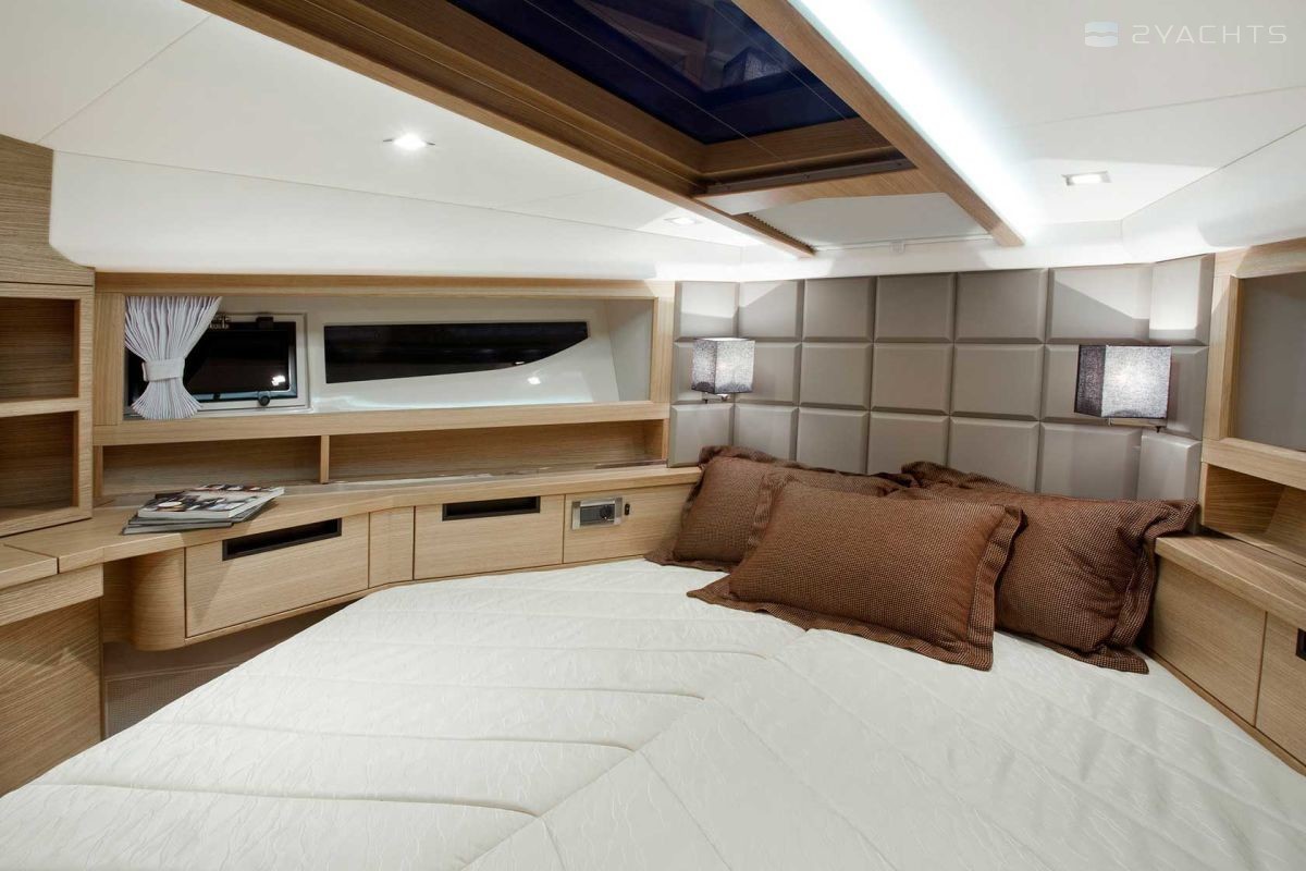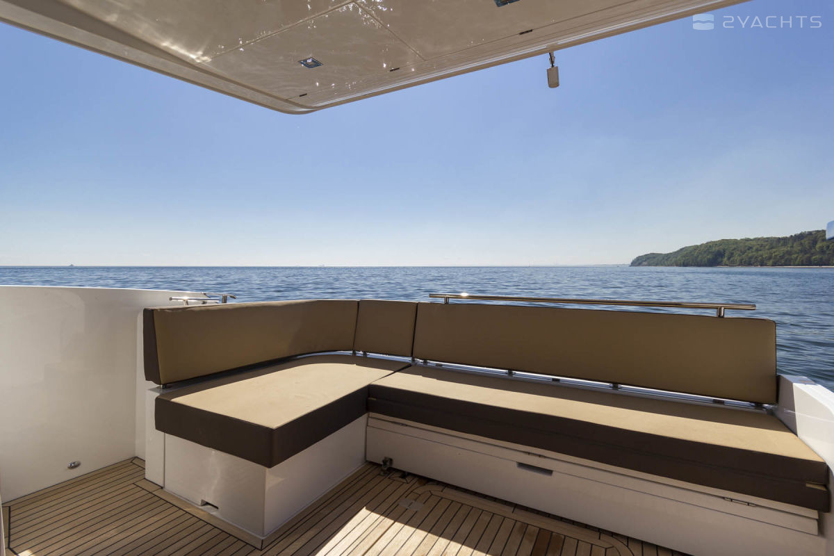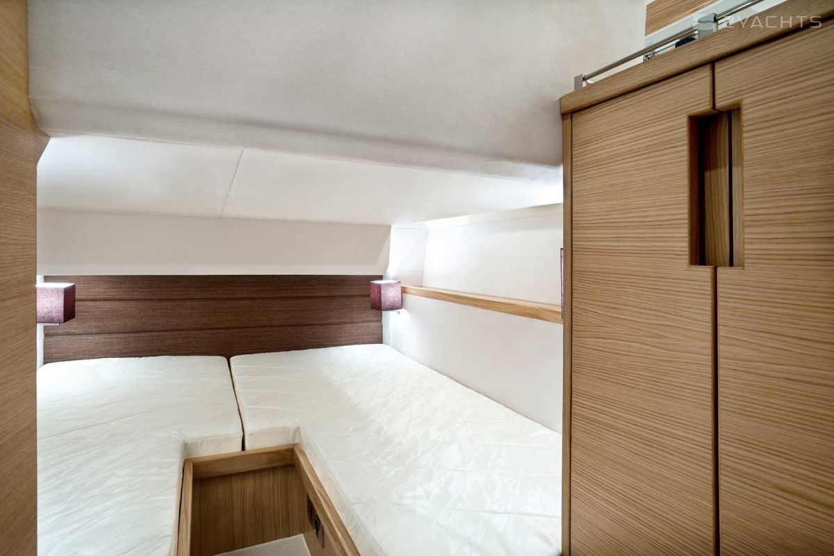 The standard power plants on the Galeon 420 Fly are two 435 hp VOLVO PENTA 2 X D6-370 DPH engines. At a cruising speed of 30 knots and with a fuel capacity of 1200 liters, it makes sea crossings of 200 miles.