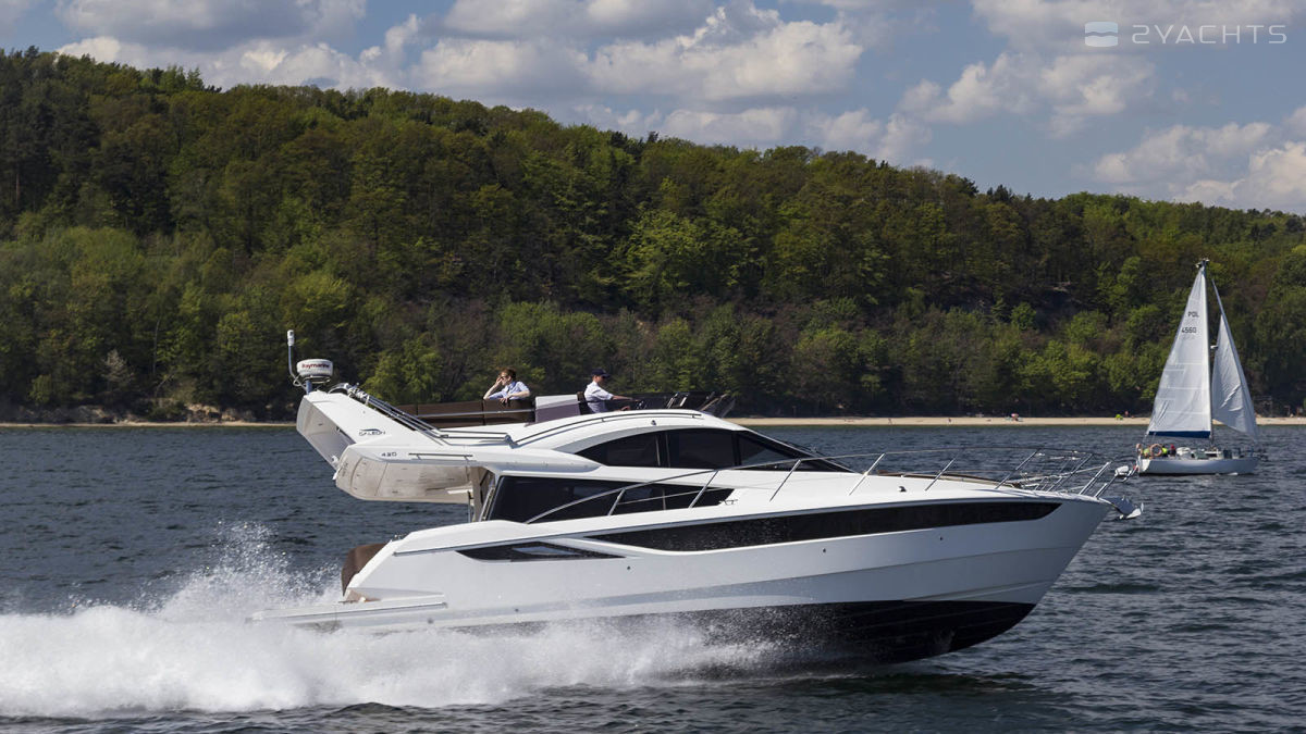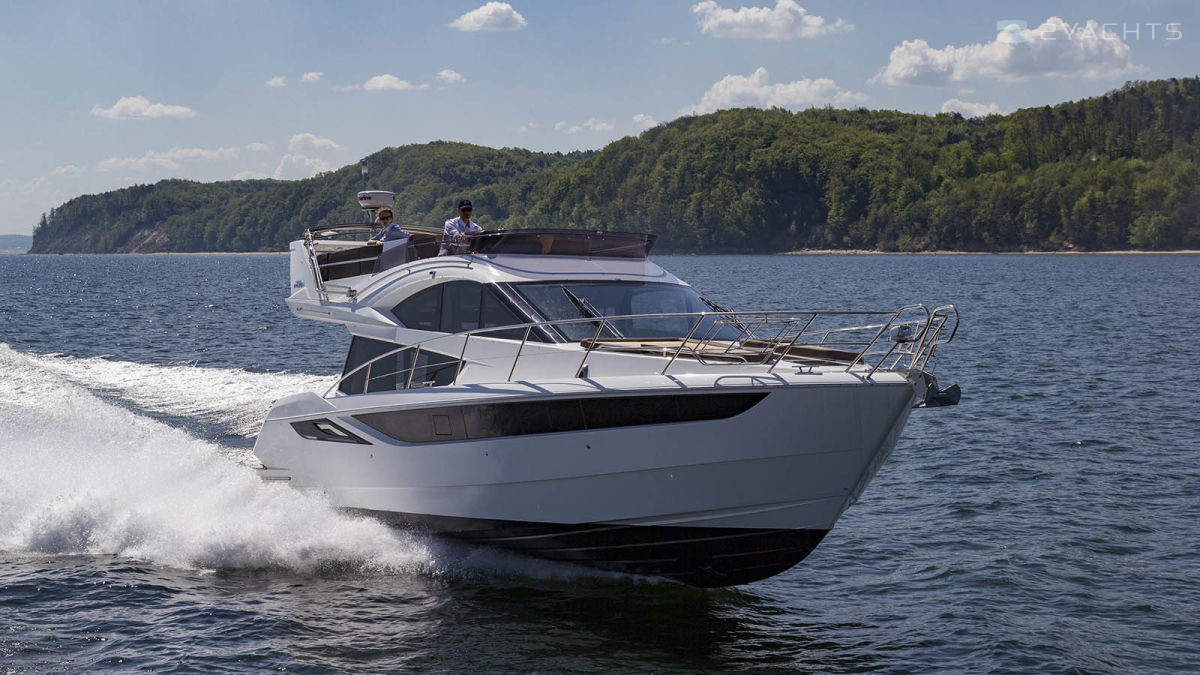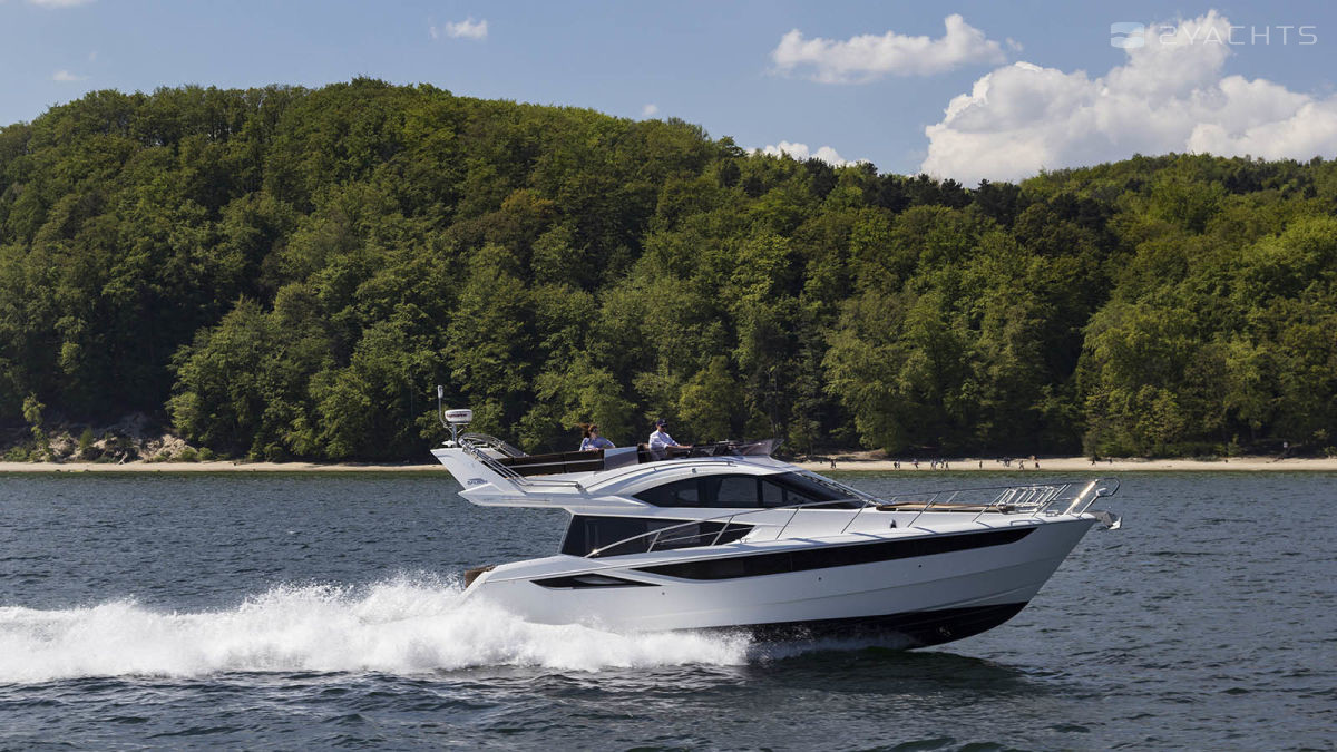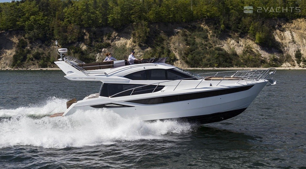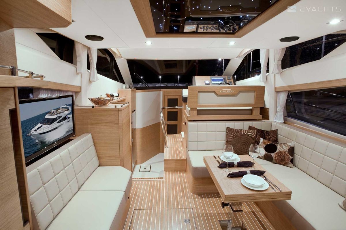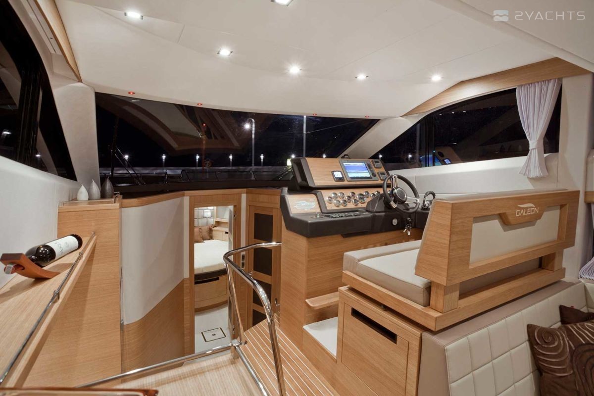 The Galeon 420 Fly was presented to the general public at the 2011 Fall Exhibitions in Cannes, Barcelona and Genoa. Galeon Architect and Designer, Tony Castro has upgraded the previous model in the series, the Galeon 400 Fly. The result is a planing three-cabin yacht with one of the most spacious interiors in its class. The model combines sports and classic style in decoration, using precious woods, high-quality textiles and accessories.