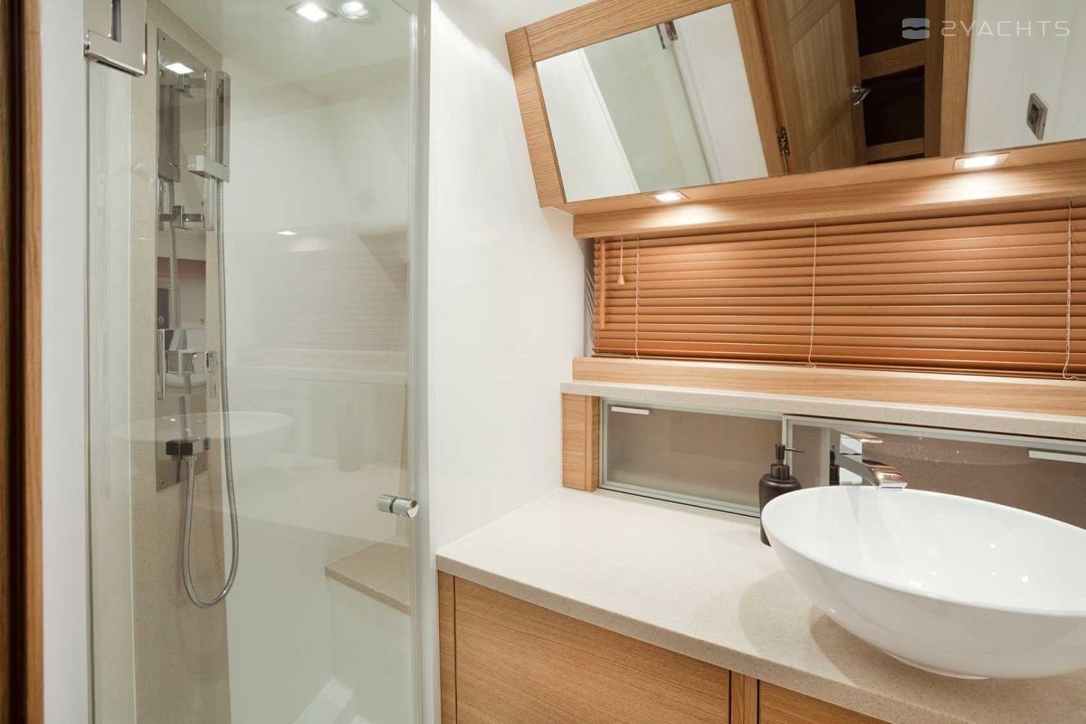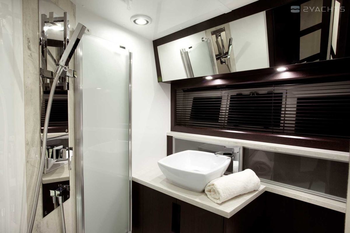 An optional bathing platform accommodates a jet ski, jet ski or tender. The main deck with a large dining table, sofas and armchairs, a control room and a galley, which can be moved to the lower deck. The design of the main deck allows you to arrange its interior space for the specific needs of the future owner.