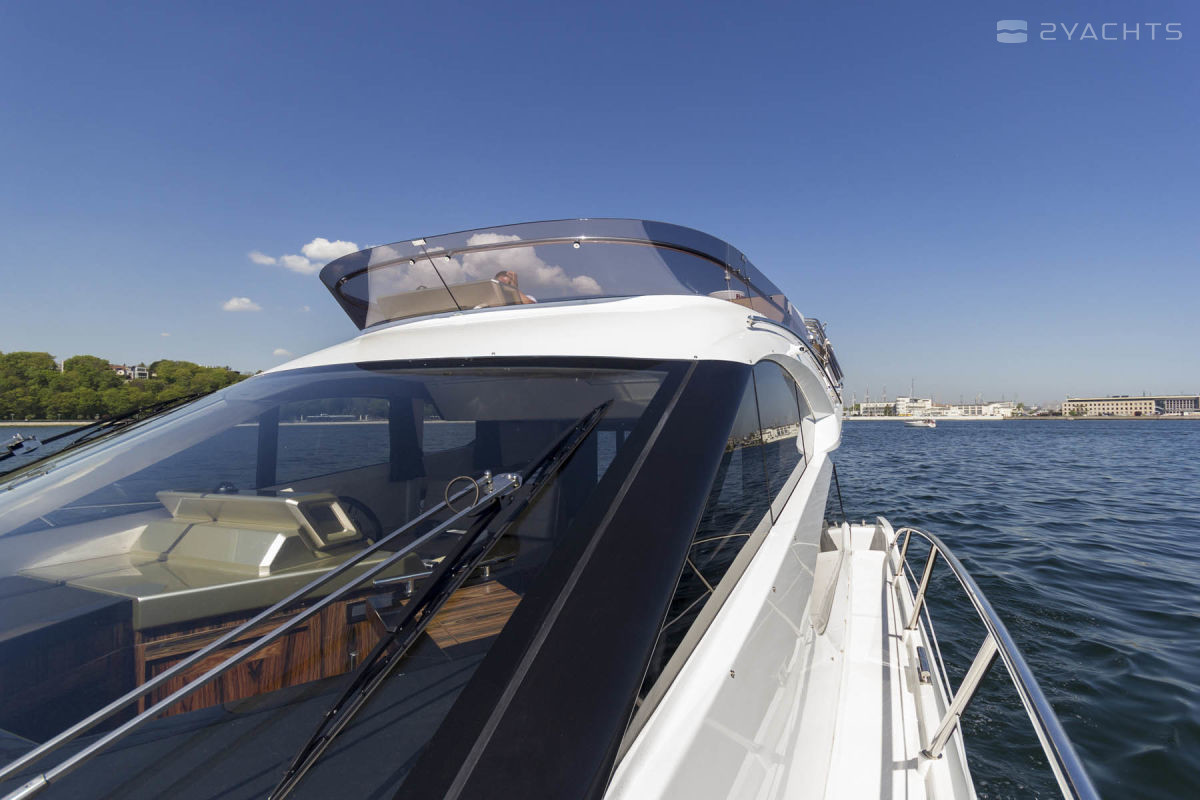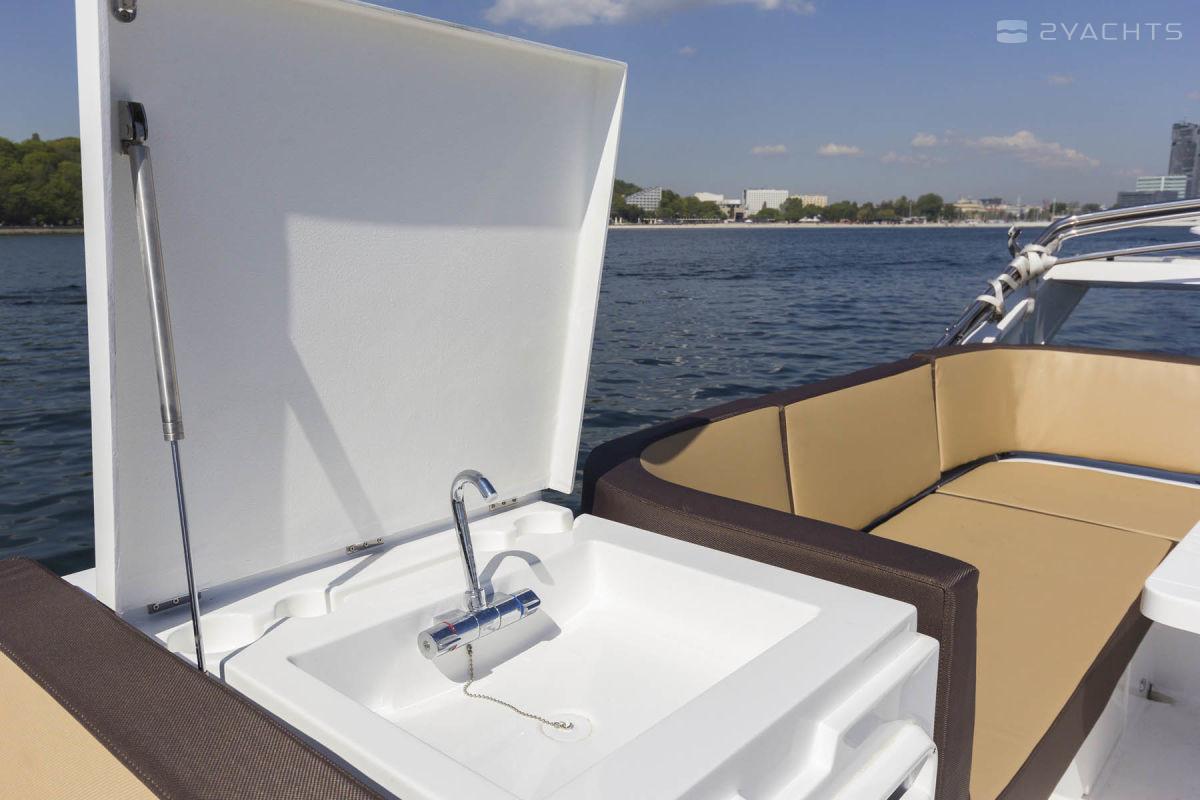 The flybridge on the Galeon 420 Fly is variable space. At the owner’s desire, it transforms into a full-fledged galley with a dining table for eight people, a grill, stove and refrigerator. The cockpit integrates folding doors with the interior.