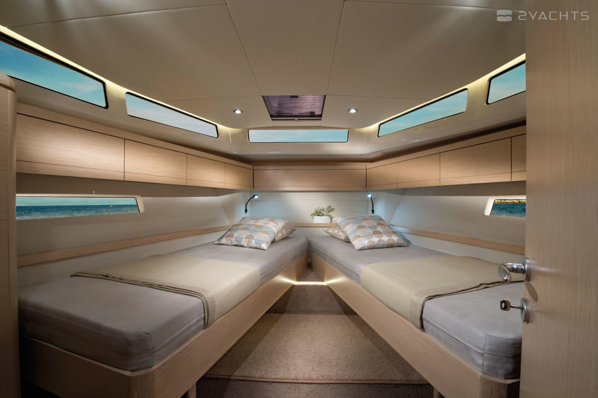 Greenline 39 is a yacht of new generation, has one main engine, 2 separate cabins, capable of great speed, provides more comfort, more convenience. Greenline 39 is the only production yacht ever offering unit air conditioning and heating as standard equipment. Air conditioning can operate during the night without the noise of a diesel generator only by lithium battery, and solar panels installed as standard, charge the lithium battery by day, and this is provided by the voltage 220V on Board always. The yacht was already the 5th generation of hull lines of its own design aimed at achieving a top speed of over 25 knots, while maintaining excellent efficiency and excellent stability in displacement mode.