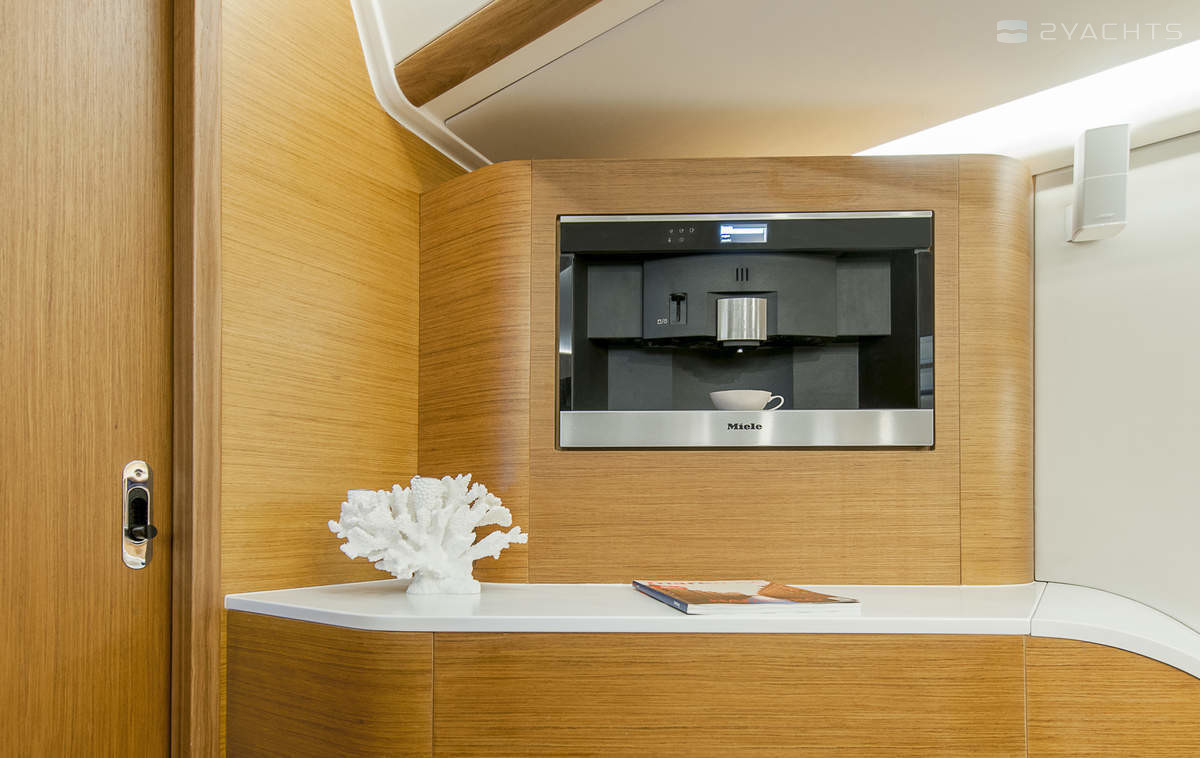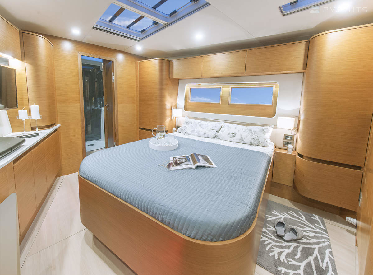 The main cabin of the yacht includes two corner sofas with dining and coffee tables, a control panel with electronic displays, a TV, and a galley with oven and electric ovens, sink, refrigerator and several drawers for food / dishes. In the bow and stern of the vessel there are spacious sleeping cabins equipped with double beds, compact sofas, wardrobes, drawers for personal belongings and separate rooms with bathrooms and showers.