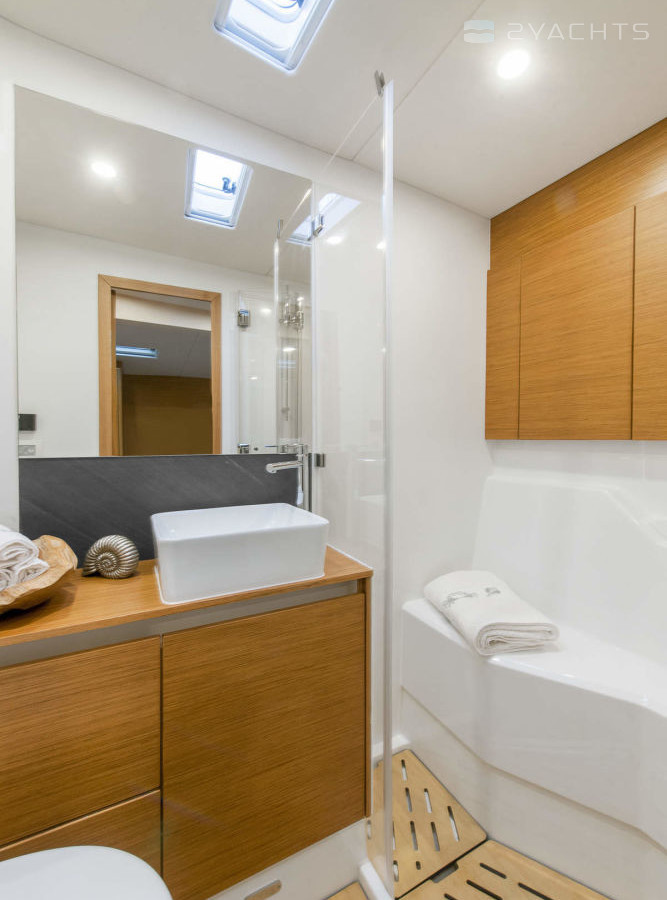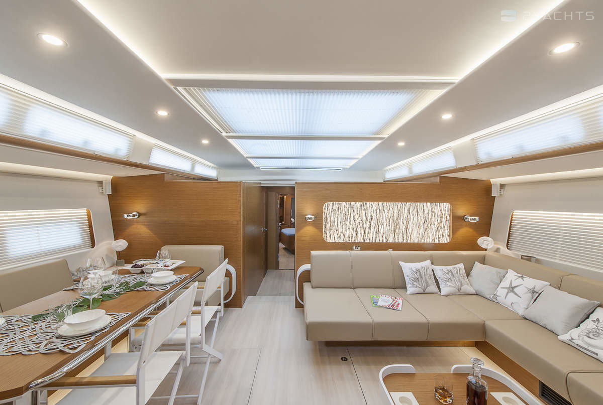 The cockpit of the vessel is equipped with a hard roof that protects it from the sun. Under it there are two sofas for several people with built-in lockers, compact folding tables and a refrigerator. Behind them there is a captain's post equipped with an electronic control panel and two chairs. At the stern of the vessel, there is a retractable platform with a removable ladder for access to the water, metal handrails and a tow bar. Through the walkways fenced with railings along the sides, you can enter the Hanse 675 bow platform, equipped with two sun loungers.