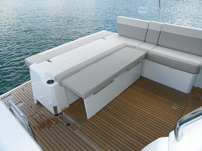 Outside, the cockpit of Jeanneau NC 33 is equipped with a corner sofa and a compact wooden table. Along the sides of the vessel there are passages to its bow, where a spacious sun lounger is installed. The stern of the boat is equipped with a platform with a ladder for access to the water and towing attachments.