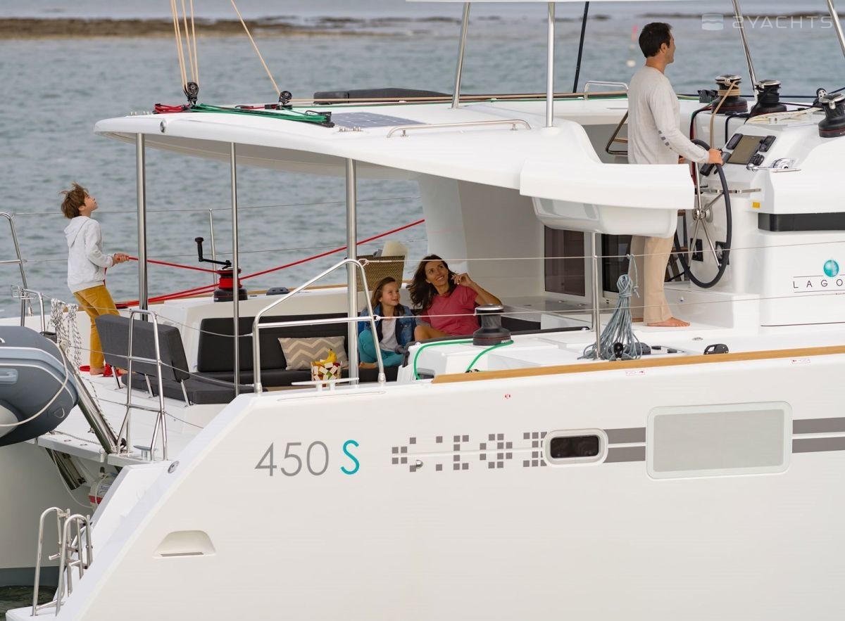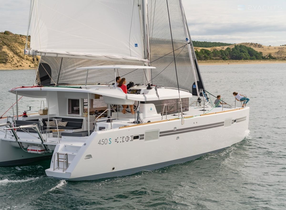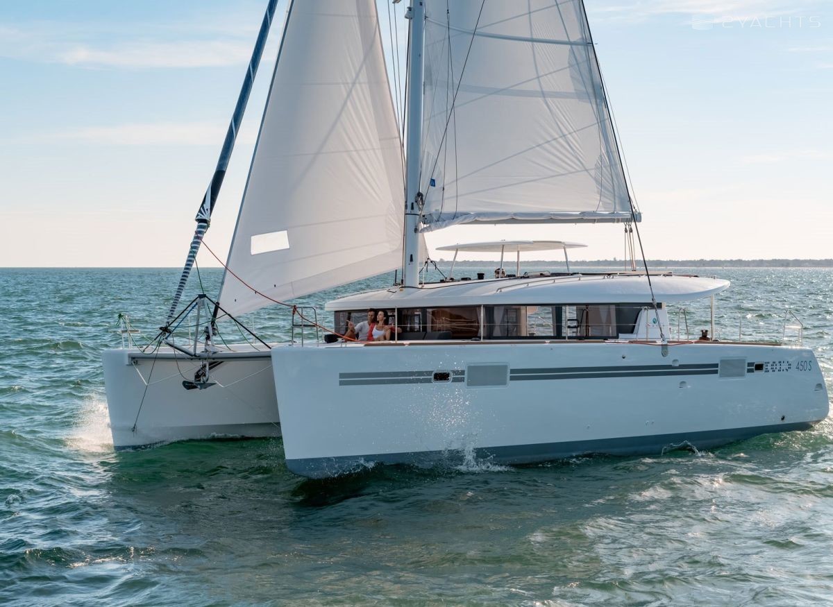 The sailing model of the Lagoon 450 S catamaran has been produced since 2016. It has a fiberglass hull, which is 13.96 meters long, 7.87 meters wide, and has a draft of 1.3 meters. The model is equipped with twelve seats and eight berths for passengers. International CE (A) certification allows it to operate on the high seas.