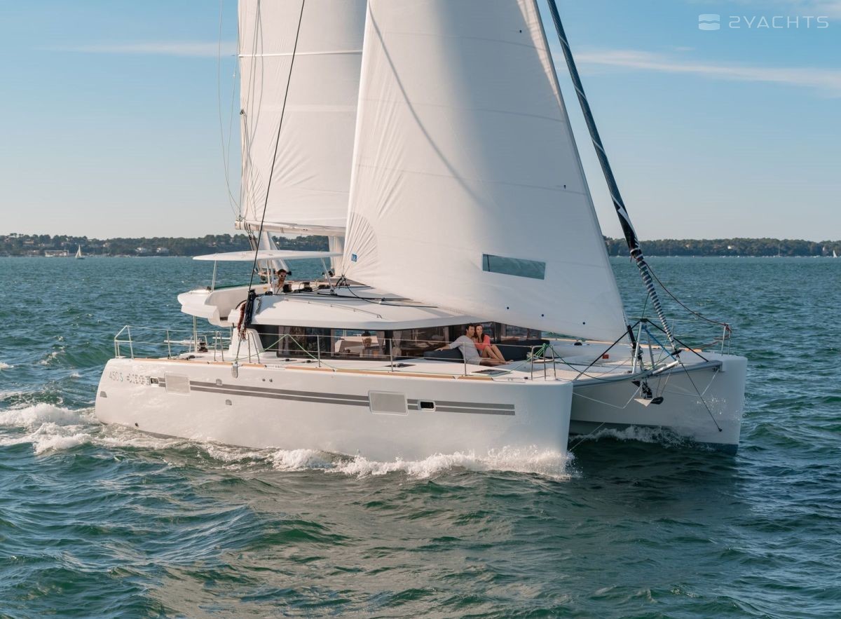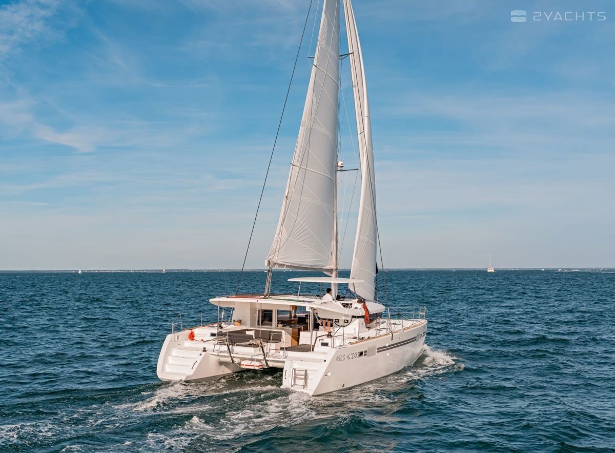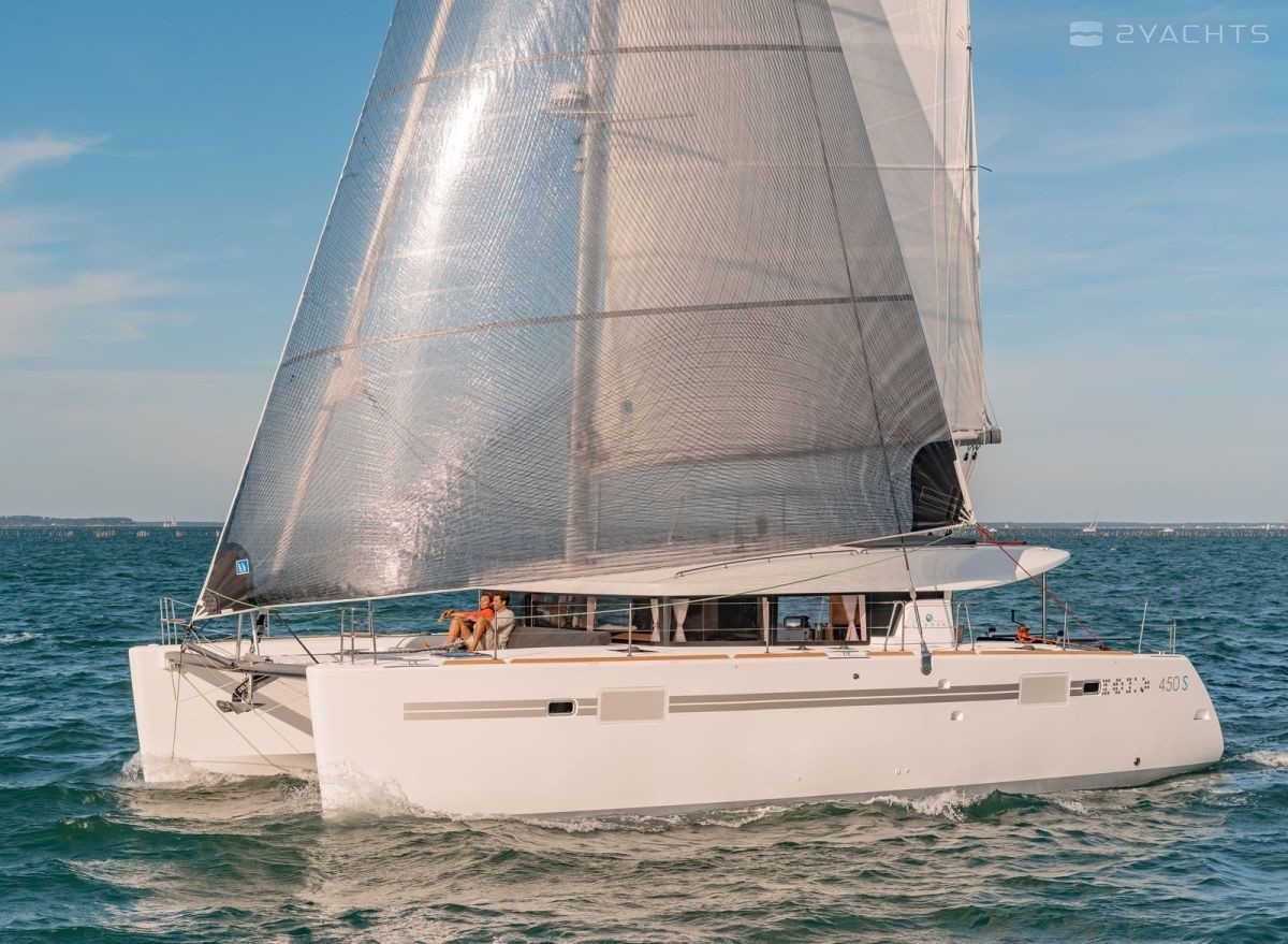 The sailing model of the Lagoon 450 S catamaran has been produced since 2016. It has a fiberglass hull, which is 13.96 meters long, 7.87 meters wide, and has a draft of 1.3 meters. The model is equipped with twelve seats and eight berths for passengers. International CE (A) certification allows it to operate on the high seas.