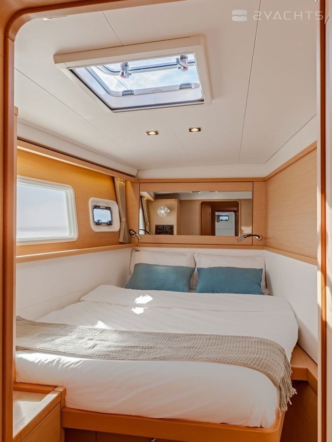 The vessel is equipped with an enclosed cockpit located on the cockpit. It has a galley with an oven, refrigerator, sink, drawers for food and dishes, as well as a corner sofa with an armchair and a wooden dining table. On the sides there are walkways leading to the sleeping cabins of the catamaran, which have beds for two people, spacious lockers for personal belongings, wardrobes and compact tables. Next to each cabin, in separate rooms, there are bathrooms with showers.